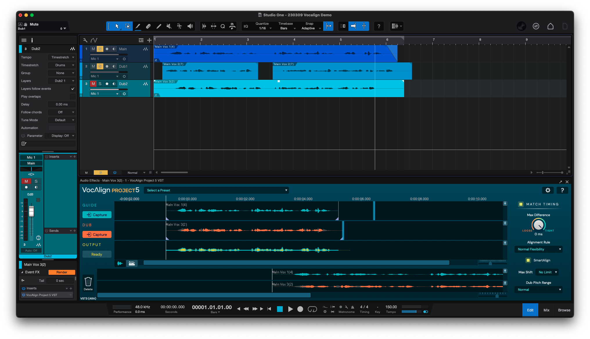 보정을 완료한 VocAlign 5 Project의 모습은 다음과 같다. 먼저 Guide 트랙에는 사이드체인을 통해 들어온 기준이 되는 트랙의 오디오 타이밍 정보가 기록되어 있고, Dub 트랙에는 방금 전 Capture를 진행한 트랙의 오디오 타이밍이 기록되오 있다. 이 상태에서 우측의 "Match Timing"을 켜 주면 자동으로 타이밍을 잡아준다. 참 쉽다!