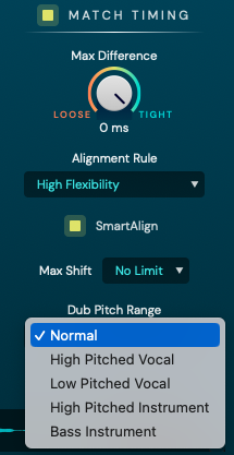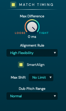 이제 우측의 설정을 확인해보자. Match Timing 아래의 "Max Difference" 노브는 Dub Track이 Guide Track에 어느 정도로 동기화될 것인지를 결정할 수 있다. 완벽하게 동기화되어야 하는 경우엔 우측의 Tight로 설정하면 되지만, 약간의 여유를 두고 싶을 경우에는 노브를 돌려 약간의 여유를 줄 수 있다.