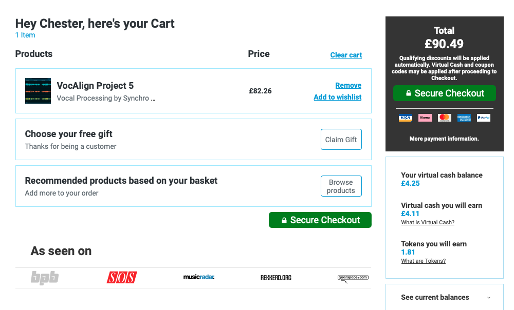 홈페이지 상단 우측에 자리 잡은 Cart를 누르면 다음과 같은 화면이 나타난다. 이 화면에서는 이번 구매로 적립되는 캐시, 구매로 적립되는 토큰을 확인할 수 있으며 상품 구매로 받을 수 있는 무료 선물을 선택할 수 있다. 만일 Plugin Boutique에서 처음 구매한다면 Claim Gift를 클릭해서 무료 선물을 받아가는 게 좋다. 플러그인 하나만 샀을 뿐인데 공짜로 다른 플러그인들도 가져갈 수 있다. 무료로 받을 수 있는 플러그인들은 기간에 따라 다르니 미리 구매 전에 어떤 걸 무료로 주는지 체크해 보는 것도 좋다. 모든 작업이 완료되었다면 초록색 "Secure Checkout"을 눌러 다음 화면으로 넘어가자.