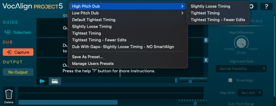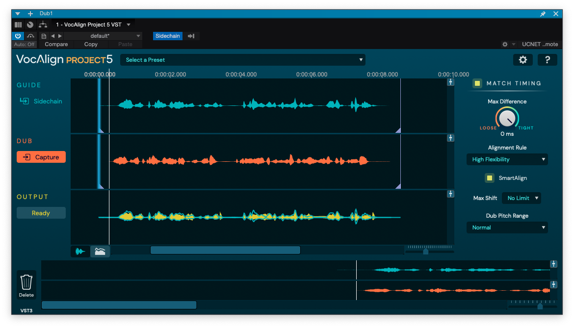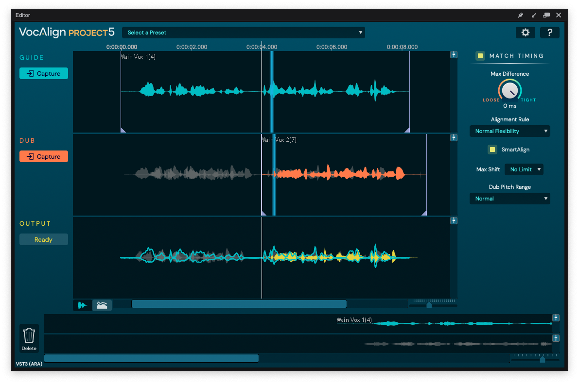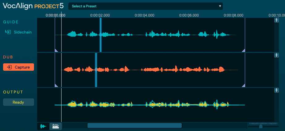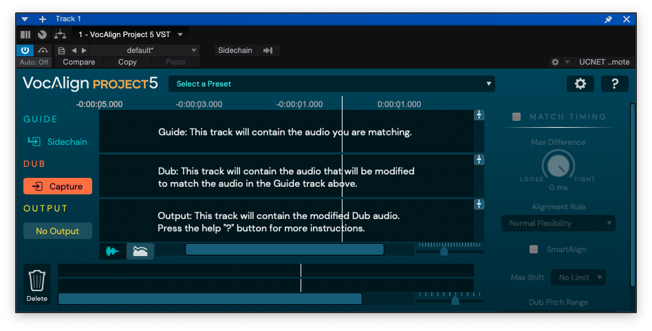 처음 VocAlign 5 Project를 트랙으로 불러오면 다음과 같은 화면이 나타난다. 이 화면에서는 누를 수 있는 버튼들이 별로 없다. 가장 먼저 VocAlign 5 Project가 음원을 분석할 수 있게 설정해야 하는 작업이 필요하다. 설정 방법은 간단하다. 타이밍을 맞추고 싶은(Dub) 오디오 트랙에 VocAlign 5 Project을 불러온 후, 기준으로 삼고 싶은(Guide) 오디오 트랙을 사이드체인으로 입력, 그리고 전통적인 방식인 오디오 Capture를 이용하면 된다. 중앙에 있는 "Capture" 버튼을 클릭 후 덥 트랙과 가이드 트랙을 동시에 재생한다. 음원이 재생되면서 오디오 파형이 VocAlign 5 Project에 기록된다. 재생을 정지하면, VocAlign 5 Project가 기록된 오디오 데이터을 바탕으로 자동으로 보정을 진행한다.