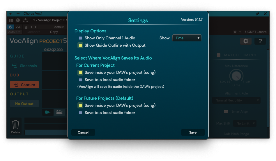 VocAlign 5 Project의 설정도 매우 단순하다. 디스플레이 옵션 및 업데이트 체크 정도다. RePitch 리뷰 당시 봤던 기능, 프로젝트로 만들어진 데이터를 어디에 저장할 건지 물어보는 옵션이 VocAlign 5 Project에도 있다. 프로젝트 외부의 폴더에 데이터를 저장할 수 있다. 만일 프로젝트가 맛이 가서 제대로 안 열리더라도 설정값은 별도의 공간에 백업되어 있다는 뜻이다. 필자는 DAW 프로젝트 파일을 믿기 때문에 프로젝트 내부에 데이터를 저장하는 방법을 선택했다.