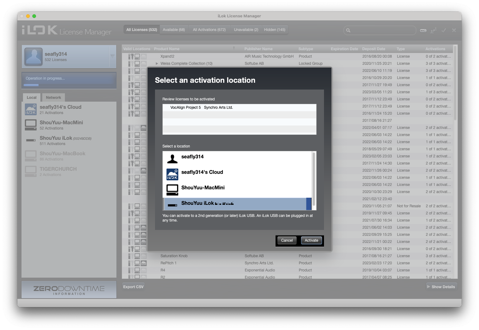 다음과 같은 화면이 나왔다면 거의 다 되었다. 라이센스를 어디에 인증할 건지 물어보는 화면인데, 필자는 iLok 동글을 가지고 있기에 iLok 동글이 인증을 선택했다. 만일 동글이 없어도 괜찮다. VocAlign 5 Project는 컴퓨터 인증이나 iLok Cloud를 지원하기에 동글이 없더라도 사용할 수 있다.