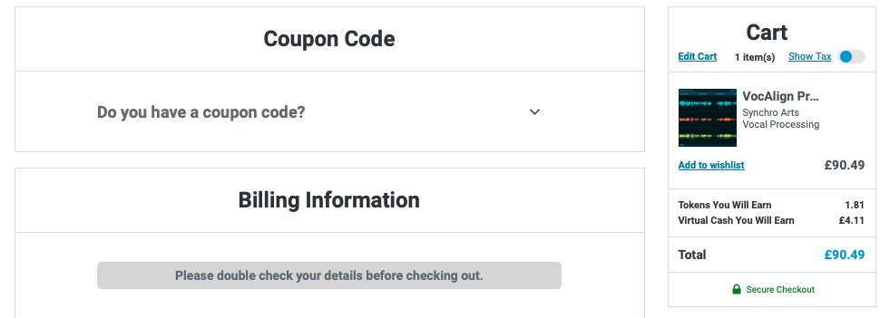 VocAlign 5 Project 구매 링크 (PluginBoutique)를 클릭하거나, Plugin Boutique(링크)에 접속한 후, 검색창에 "VocAlign 5 Project"를 검색하면 위와 같은 화면이 나타난다. Plugin Boutique는 회원 가입을 하지 않아도 상품 구매가 가능하지만, 회원 가입을 하는 편이 추후 라이센스 관리에 용이하다. 기본값은 파운드화로 나타나지만 달러나 엔, 유로화로 가격을 바꿔가며 확인할 수 있다. 다만, 대한민국 원은 지원하지 않으므로 해외 결제가 지원되는 카드나 페이팔 계정을 미리 준비할 필요가 있다. Add to Cart를 클릭하여 상품을 내 장바구니로 담자.