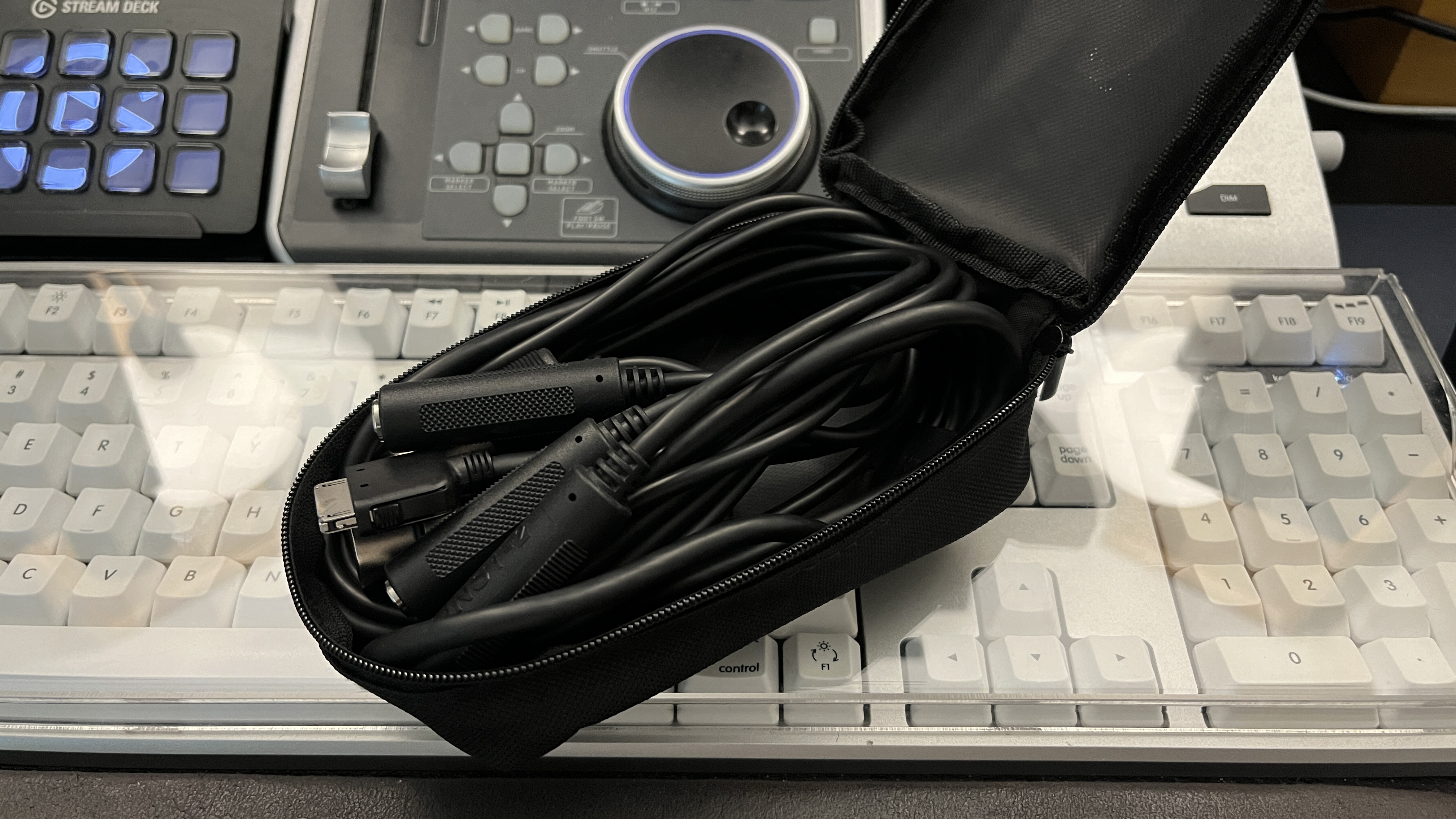 브레이크아웃 케이블 파우치를 열면 거대한 선들의 무더기를 볼 수 있다. Apogee Duet3에 연결해 사용하는 브레이크아웃 케이블이다. 예전에는 휴대성을 위해 다른 오디오 인터페이스 제조사들도 많이 채택하던 방식인데 요즘에는 찾아보기 힘든 방식이다. XLR 단자부터 TRS 단자까지 Duet 3을 사용하기 위한 필수적인 단자들이 이 케이블을 통해 연결된다. 생각보다 선재가 굵고, 튼튼하게 결착되어 있어 단선을 염려하지 않아도 될 듯하다.