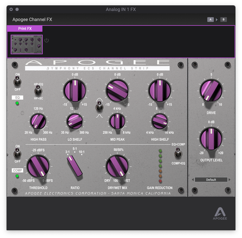 Apogee Duet 3의 특징이 하나 더 있는데, 바로 Babyface Pro처럼 내장 DSP가 들어 있어 채널 FX를 사용할 수 있다. 기본적으로 사용할 수 있는 채널 FX는 Apogee의 ECS 채널 스트립인데, EQ와 컴프를 걸 수 있어 보컬 및 악기 레코딩 시 다용도로 사용할 수 있다. 필자는 Babyface Pro에서 컴프레서가 없다는 점이 굉장히 아쉬웠는데, Apogee에는 들어 있다는 점이 굉장히 인상 깊었다.