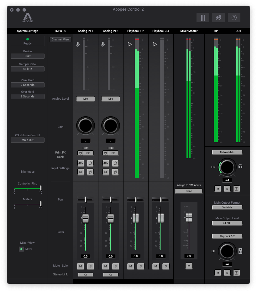 Apogee Duet3 전면에는 조작할 수 있는 기능이랄 게 별로 없다. 그렇기에 대부분의 기능들을 전용 소프트웨어를 이용하여 조작하게 된다. 이럴 때 필요한 프로그램이 바로 Apogee Control 2다. Apogee의 오디오 인터페이스들은 대부분 이 소프트웨어를 통해 조작을 하게 되는데, 소프트웨어 업데이트며 인터페이스의 조명 설정 등 다양한 부분들을 여기서 할 수 있다. 필자가 연결한 Duet 3이 2 in 4 Out 형태의 간단한 입출력을 가지고 있기에 믹서 창 또한 간단한 편이다. Playback 채널이 요즘 추세에 맞춰서 4 채널을 제공해주고 있다는 점도 맘에 든다. 사실 96만 원짜리에 Playback 채널이 4 채널은 기본적으로 들어있어야 하는 게 아닌까 하지만.