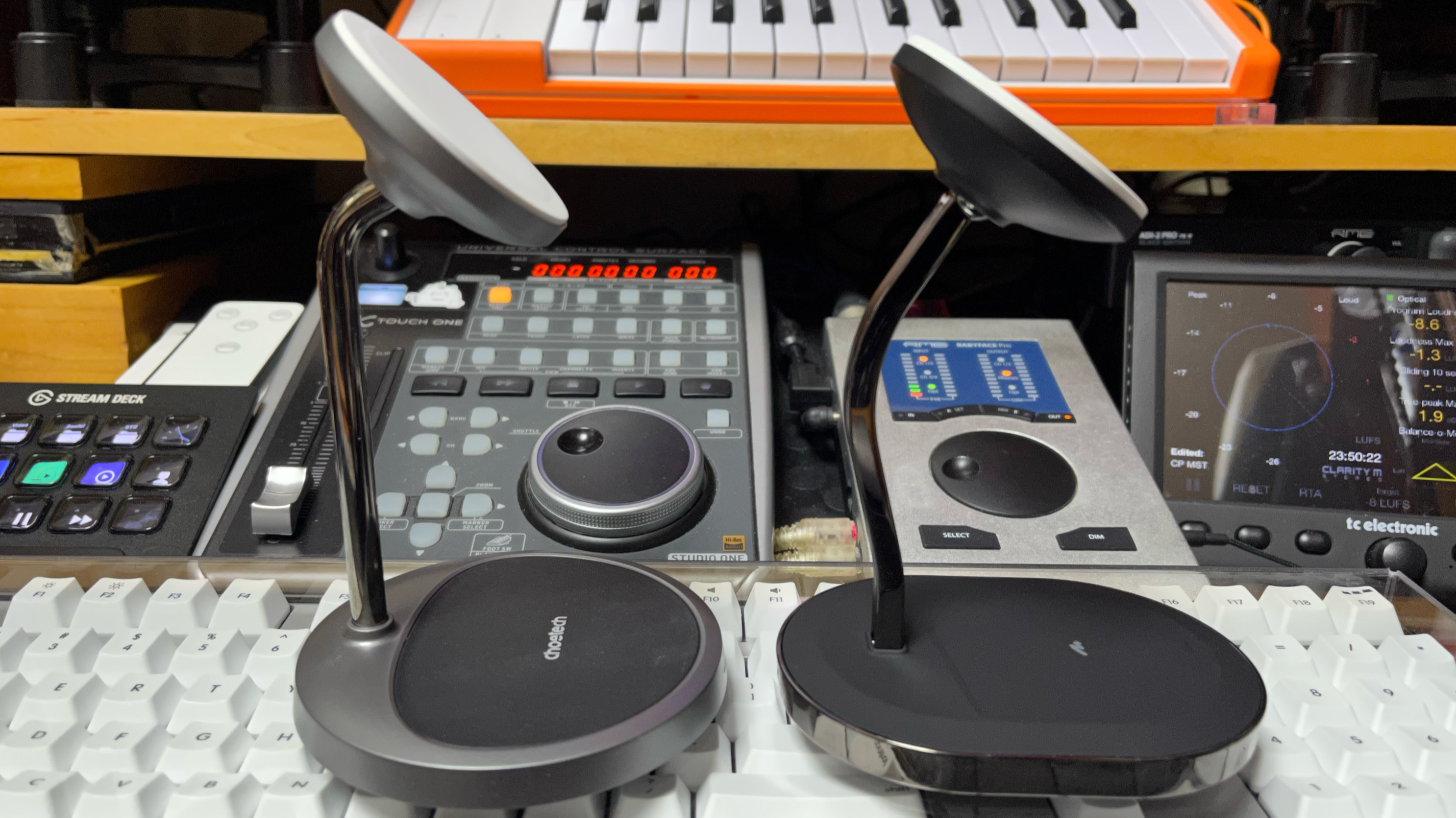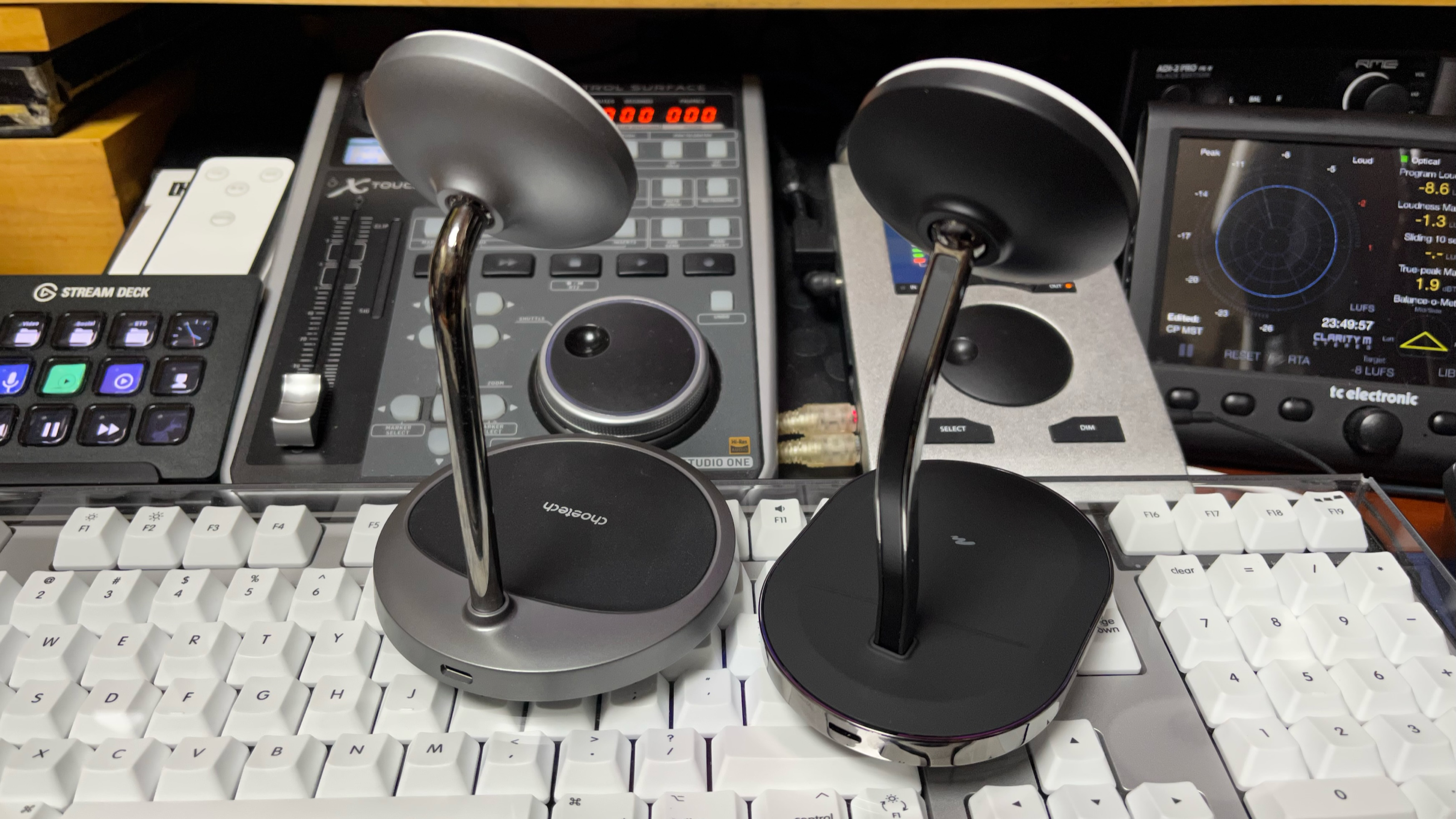 좌측이 초텍의 T575-MFM, 우측이 아트뮤 MC210이다. 사실 디자인부터 둘은 큰 차이를 가지고 있다. T575-MFM은 전통적인 전등 스탠드의 모습을 가지고 있어 MFM 모듈과 하단의 무선 충전 모듈이 연결되어 있는 금속제 막대기가 직선으로 구성되어 있다. 반면 아트뮤 MC210은 약간 곡선처리가 되어 있어 전등 스탠드의 이미지라기보단 아트뮤의 독특한 재해석이 적용된 공중부양형 무선 충전기의 모습이다. 사용된 소재에서도 차이가 약간 있는데, T575-MFM은 MFM 모듈이 붙어있는 스탠드에만 금속이 사용되었다면 아트뮤의 MC210은 하단의 무선충전 모듈의 테두리, 스탠드 등에 사용되었다.