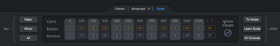 우측의 Scale은 각각의 키 스케일을 사용자가 직접 편집할 수 있다. 각각의 Key마다 다르게 설정할 수 있으며, Cents값으로 디테일하게 수정할 수 있다. 바로 위의 Flex Tune와 함께 사용한다면 보컬에 맞는 스케일을 만들어 음계에 딱 맞도로 음정 보정을 진행할 수 있다. 전체적으로 라이브 환경에 사용하기 적합한 기능이라 일반적인 사용자들에게는 필요 없는 기능일 수도 있다. 그러니까 Advanced에 기능이 들어가 있는지도 모르겠다.