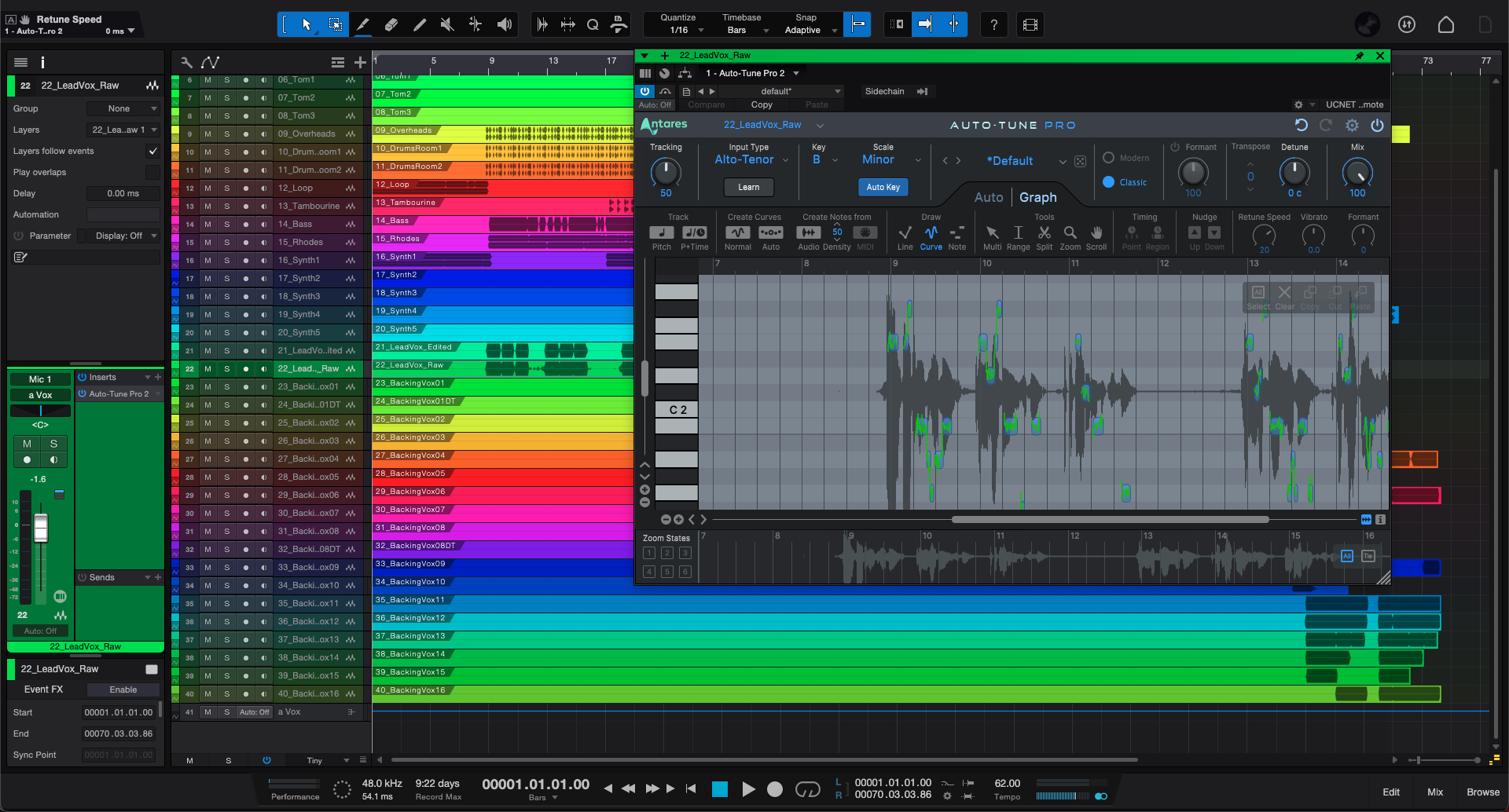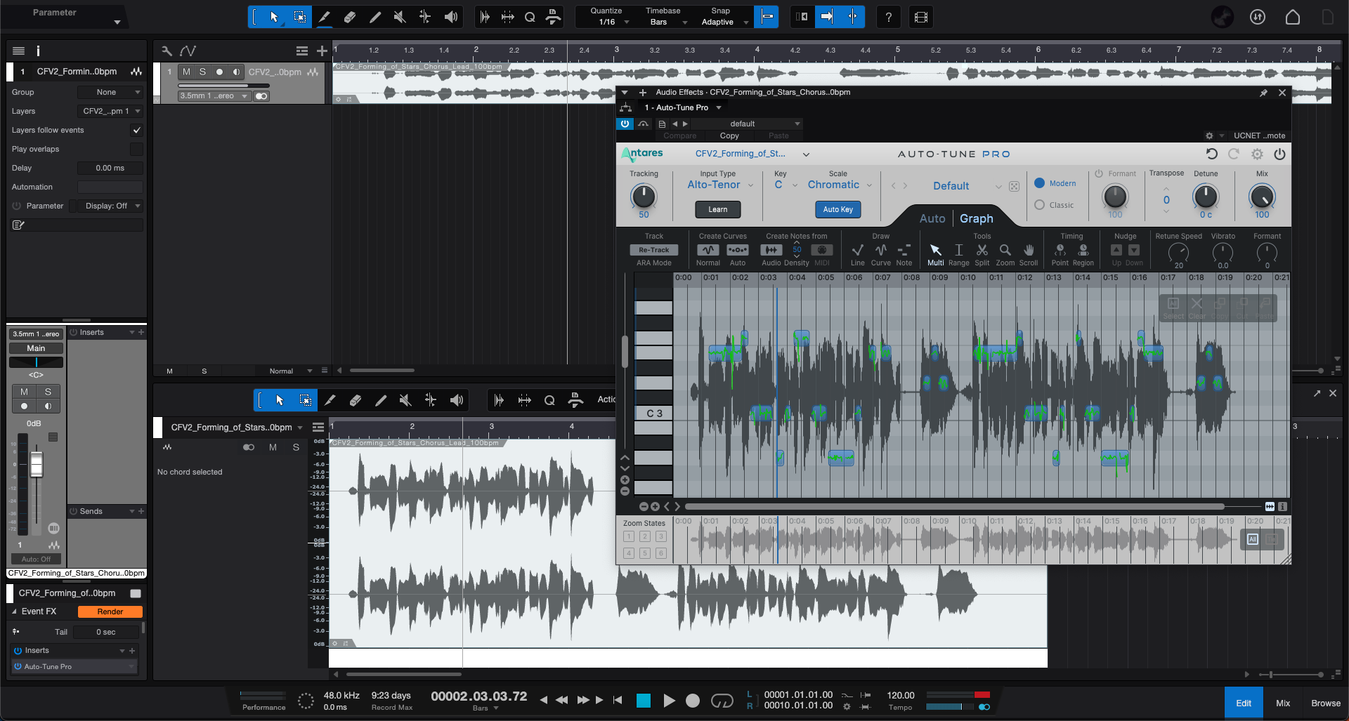 Auto-Tune Pro X는 시장을 선도하는 음정 교정 기술을 가진 기업답게 최신 규격인 ARA2를 지원한다. 그렇기에 특별한 설정 없이도 DAW와 유기적으로 맞물려 작동한다. 현재 ARA2로 Auto-Tune Pro X를 이용할 수 있는 DAW는 Logic Pro와 Studio One 뿐이지만, 추후 업데이트로 늘어날 예정이다. 다만 살짝 아쉬운 부분이 하나 있는데, Auto-Tune Pro X은 ARA2로 사용할 때 내장 오디오 편집기를 대체하지 않는다. 그렇기에 Studio One에서 ARA2로 Auto-Tune Pro X를 사용하려면 Edit 모드가 아닌 Melodyne이나 RePitch 등 ARA2를 지원하는 다른 음정 교정 프로그램들이 내장 오디오 편집기를 대체하는 형태로 ARA2 사용이 가능해 큰 화면으로 음정 편집을 할 수 있다는 점을 생각한다면 이는 굉장히 아쉬운 부분이다. 그렇기에 필자가 이용하는 Studio One에서는 Event FX에 플러그인을 넣어야 ARA2로 Auto-Tune Pro X를 사용할 수 있다. 플러그인을 거는 과정이 귀찮다는 점을 제외하면 Auto-Tune Pro X는 ARA2의 장점들을 그대로 누릴 수 있다. 캡쳐 같은 귀찮은 과정 없이 곧바로 오디오 편집 작업에 들어갈 수 있는 점 때문에 필자가 ARA2를 지원하는 플러그인들을 굉장히 좋아한다. Auto-Tune Pro X는 완벽하진 않아서 반쪽짜리 ARA2라고 생각하지만.