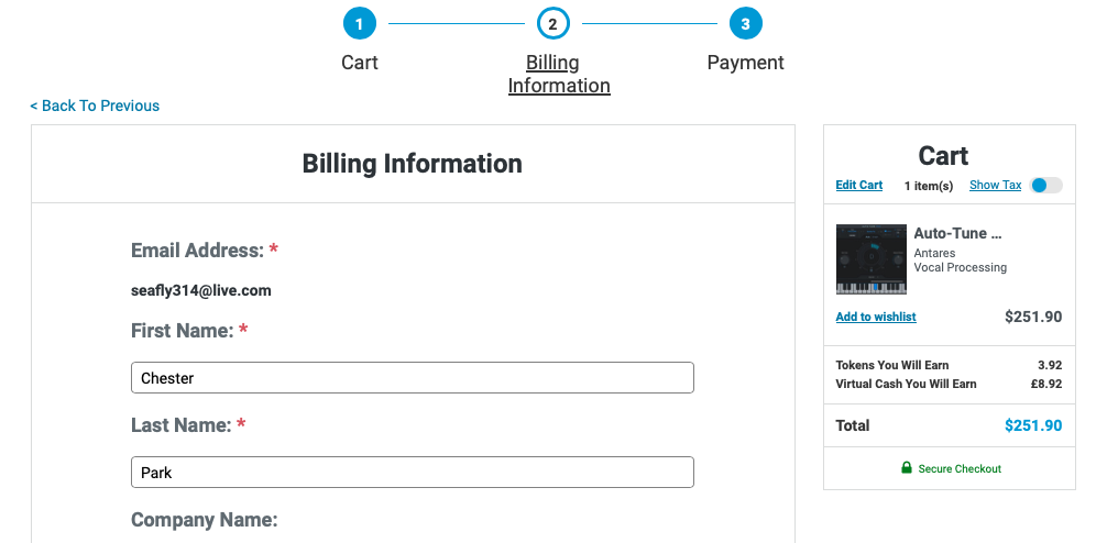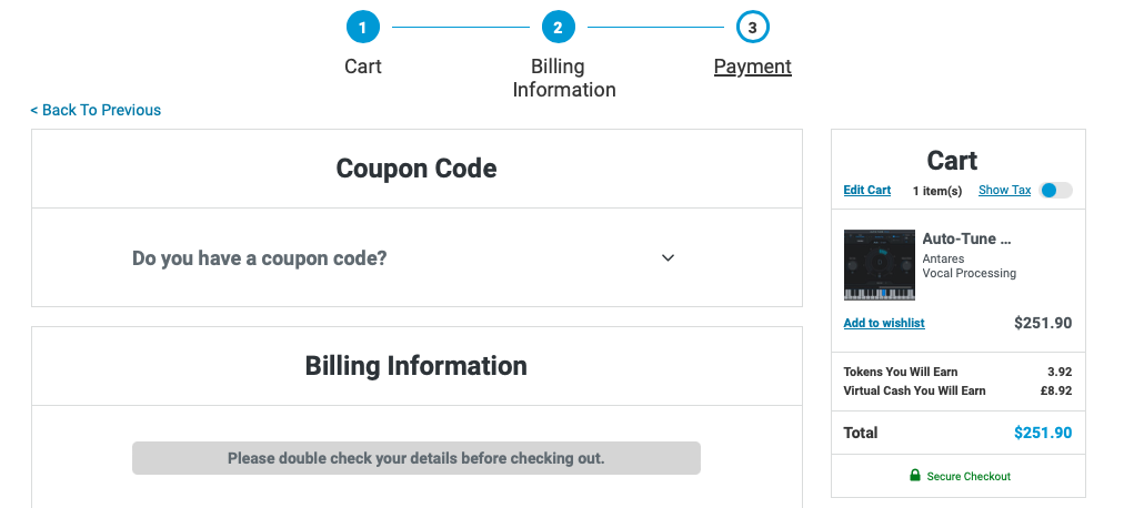 Auto-Tune Pro X 구매 링크 (PluginBoutique)를 클릭하거나, Plugin Boutique(링크)에 접속한 후, 검색창에 "Auto-Tune Pro X"를 검색하면 위와 같은 화면이 나타난다. 특히 Auto-Tune Pro X를 구입하면 구독 상품인 Auto-Tune Unlimited 1년 이용권이 같이 증정되기에 Antares의 다른 플러그인들도 부담 없이 사용해 볼 수 있다. Plugin Boutique는 회원 가입을 하지 않아도 상품 구매가 가능하지만, 회원 가입을 하는 편이 추후 라이센스 관리에 용이하다. 기본값은 파운드화로 나타나지만 달러나 엔, 유로화로 가격을 바꿔가며 확인할 수 있다. 다만, 대한민국 원은 지원하지 않으므로 해외 결제가 지원되는 카드나 페이팔 계정을 미리 준비할 필요가 있다. Add to Cart를 클릭하여 상품을 내 장바구니로 담자.