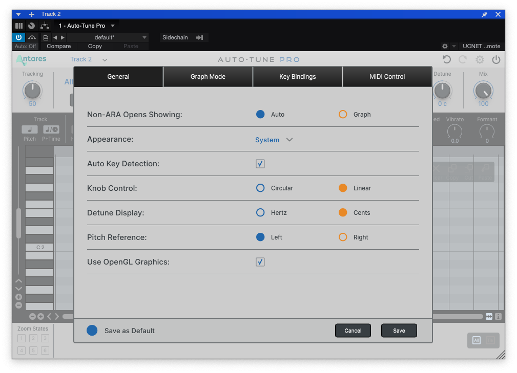 Preference를 클릭하면 Auto-Tune Pro X에 대한 보다 깊은 설정을 만질 수 있다. 기본 설정과 그래프 모드에 대한 설정, 그리고 키 매핑 및 미디 컨트롤 등 Auto-Tune Pro X를 다룰 때 도움이 되는 기능들이 많이 모여 있다. 특히 다크 모드와 라이트 모드를 왕복하면서 사용하는 기능 또한 설정에 들어 있으므로 체크해 보기를 권장한다. 키 매핑이 자유롭게 된다는 점이 특히 마음에 들었는데, ARA2 모드로 사용했을 때, 부담 없이 CTRL+Z를 해도 플러그인이 지워지는 경우가 없어 너무너무너무너무 마음에 든다.