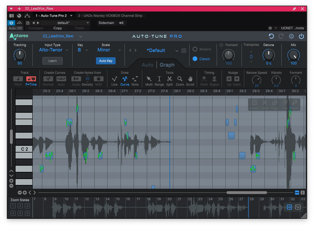 Auto-Tune Pro X에는 현재의 Auto-Tune을 만들어준 비장의 무기가 숨어 있는데, 바로 Graph 모드다. 앞서 살펴봤던 Auto 모드는 라이브는 이름 그대로 음정 및 박자를 그래프로 볼 수 있는 모드다. 우리가 일반적으로 사용하는 Melodyne이나 Repitch, Waves Tune의 방식이 다 이 방식이다. 조작 방식은 다른 음정 보정 툴과 크게 다르지 않다. Tools에서 각각의 노트들을 조작하고 자를 수 있고 Draw에서 음정 커브를 직접 그릴 수 있다. 박튠도 훨씬 직관적으로 할 수 있어서 편집에도 강하다. 앞서 Auto 모드에서 살펴봤던 Retune Speed, Vibrato, Formant도 각각의 음정 커브마다 다르게 걸 수 있어서 자유도가 훨씬 높다. 다만 제대로 Graph 모드를 이용하려면 펜 타블렛은 필수다. Graph 모드를 사용한다는 뜻은 더욱 정확하게 커브를 그리고자 하는 경우가 많은데, 타블렛은 필수적이다.