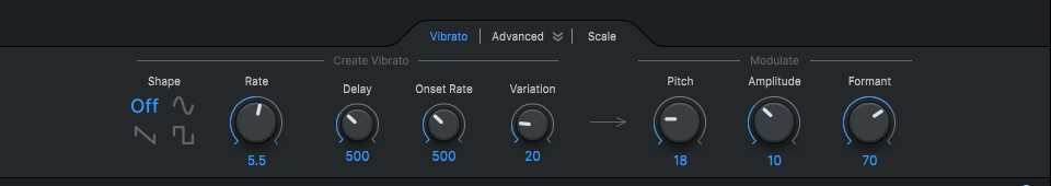 가장 좌측에 있는 모드는 Vibrato인데, Create Vibrato를 거쳐 Modulate를 통과하는 구조로 되어 있다. LFO 커브부터 LFO 주기, 딜레이, 작동 빈도, 그리고 바레이션 등을 조절할 수 있다. Modulate에서는 음정 및 세기, 그리고 포먼트 되는 정도를 수정할 수 있다. 노래를 불러본 분들이라면 빠르게 이해할 수 있을 만한 개념들이다. 만일 모르겠다면 매뉴얼을 바로 정독하자.