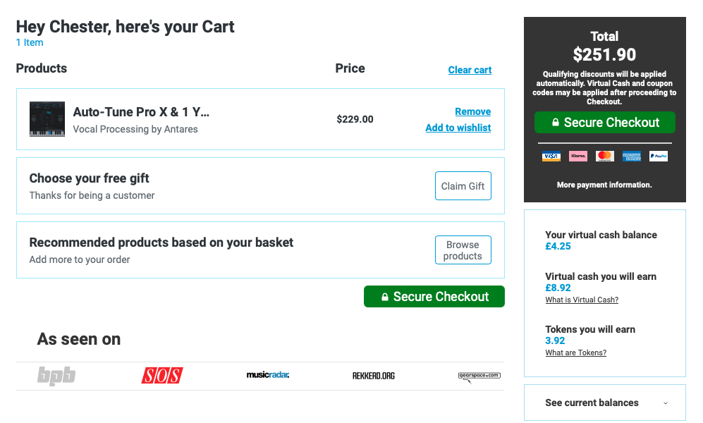 홈페이지 상단 우측에 자리 잡은 Cart를 누르면 다음과 같은 화면이 나타난다. 이 화면에서는 이번 구매로 적립되는 캐시, 구매로 적립되는 토큰을 확인할 수 있으며 상품 구매로 받을 수 있는 무료 선물을 선택할 수 있다. 만일 Plugin Boutique에서 처음 구매한다면 Claim Gift를 클릭해서 무료 선물을 받아가는 게 좋다. 플러그인 하나만 샀을 뿐인데 공짜로 다른 플러그인들도 가져갈 수 있다. 무료로 받을 수 있는 플러그인들은 기간에 따라 다르니 미리 구매 전에 어떤 걸 무료로 주는지 체크해 보는 것도 좋다. 모든 작업이 완료되었다면 초록색 "Secure Checkout"을 눌러 다음 화면으로 넘어가자.