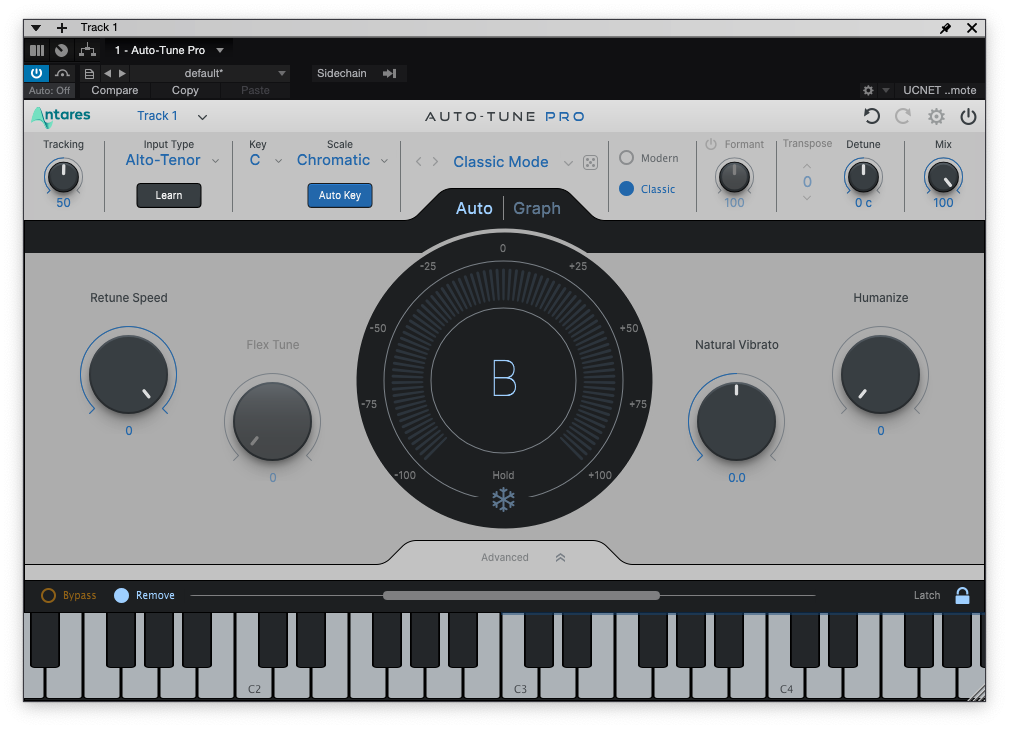 가장 먼저 위에 있는 기능부터 살펴보자. 좌측에 있는 Tracking은 Auto-Tune으로 들어오는 소스의 음정을 분석하는 과정에서 얼마나 많이 값이 바뀌게 될 것인지의 상한선을 결정한다. 매뉴얼에 따르면 특별히 문제가 없다면 50으로 놓고 쓰는 걸 권장하지만, 만일 이펙트가 적용되면서 클릭음 및 팝핑이 발생한다면 Tracking 값을 낮게 설정하고, 소리의 크기가 크거나 보컬 공연처럼 일정하지 않은 소스의 경우 높은 값으로 설정하는 게 좋다.