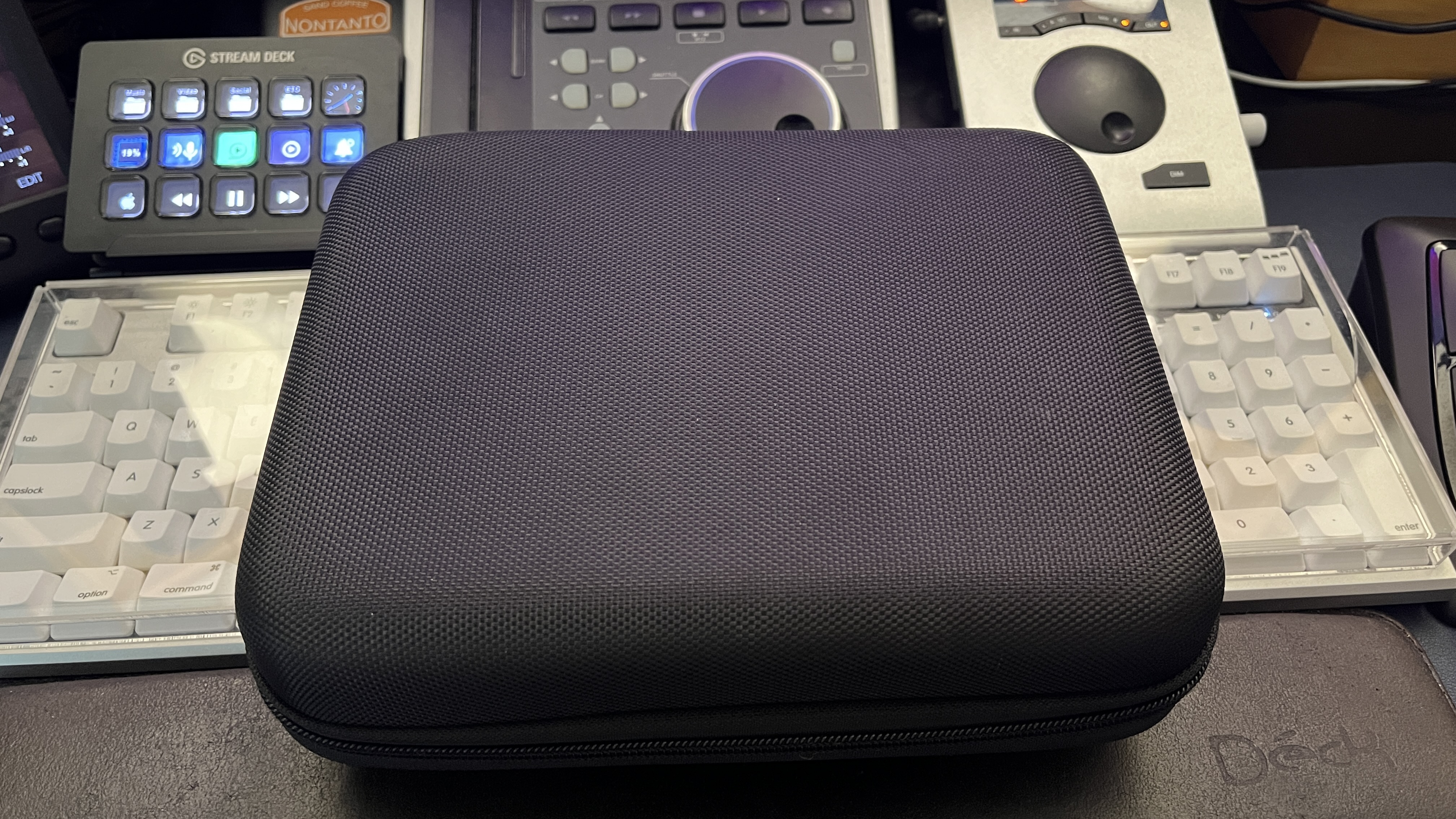 정체분명의 상자가 필자의 작업실에 도착했기에 빠르게 개봉을 했다. 필자가 받은 제품은 체험을 위한 제품이라 정식 패키지 대신 캐링 케이스가 왔다. 이 캐링 케이스도 번들로 제공되는 구성품 중 하나다. 이 안에 오늘의 주인공, Apogee Duet 3이 담겨 있다. 부드러운 타입이 아닌 구조물이 있는 하드 타입이라 충격 보호에 어느 정도 효과가 있어 보인다. 재질은 플라스틱이 아닌 직물 소재라 약간의 충격 흡수도 될 듯하다. 전면에는 Apogee 로고가 인쇄되어 있다. 표면을 만져보니 레이저 인쇄가 아닌 염색으로 보여 이물질이 묻더라도 지워지진 않을 듯하다.