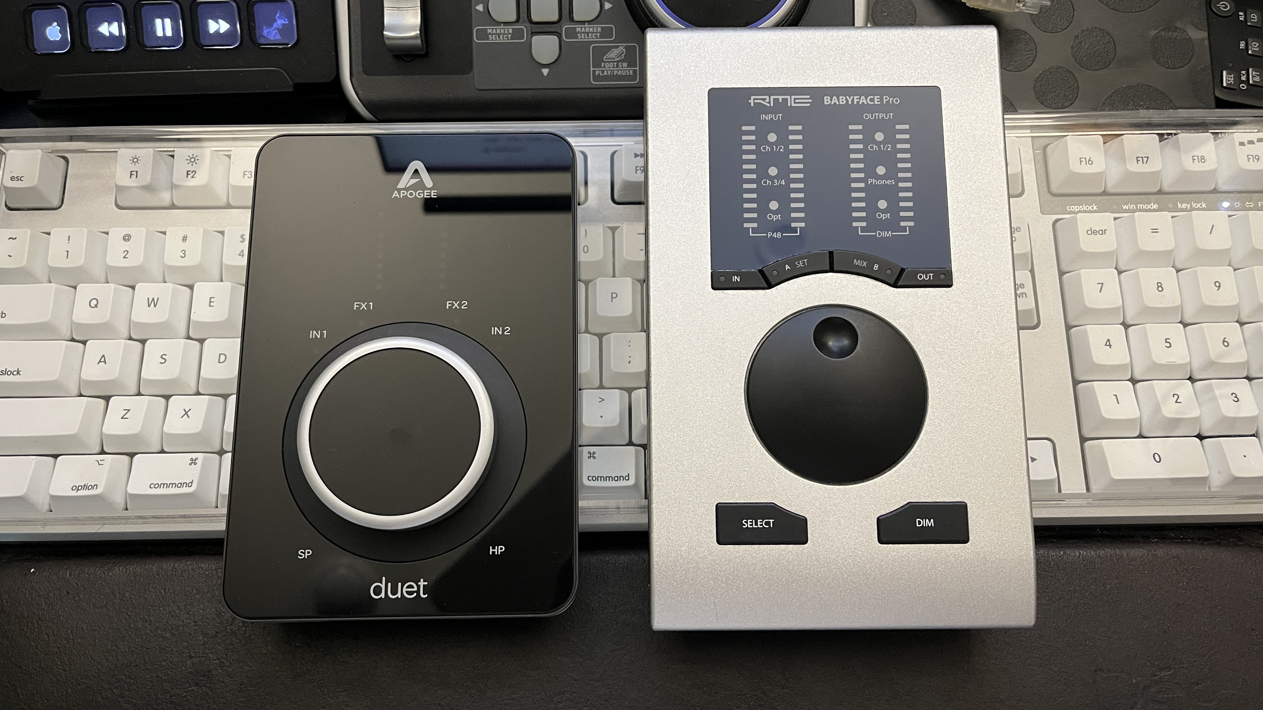 Apogee Duet 3을 Babyface Pro와 같이 나란히 놓아보았다. 가로 사이즈는 비슷하다는 인상이다. 다만 가운데의 노브는 Duet 3이 훨씬 크다는 느낌이다. 또한 조작부가 크게 없어 Duet 쪽이 조금 더 깔끔하고 세련되었다는 느낌이다.