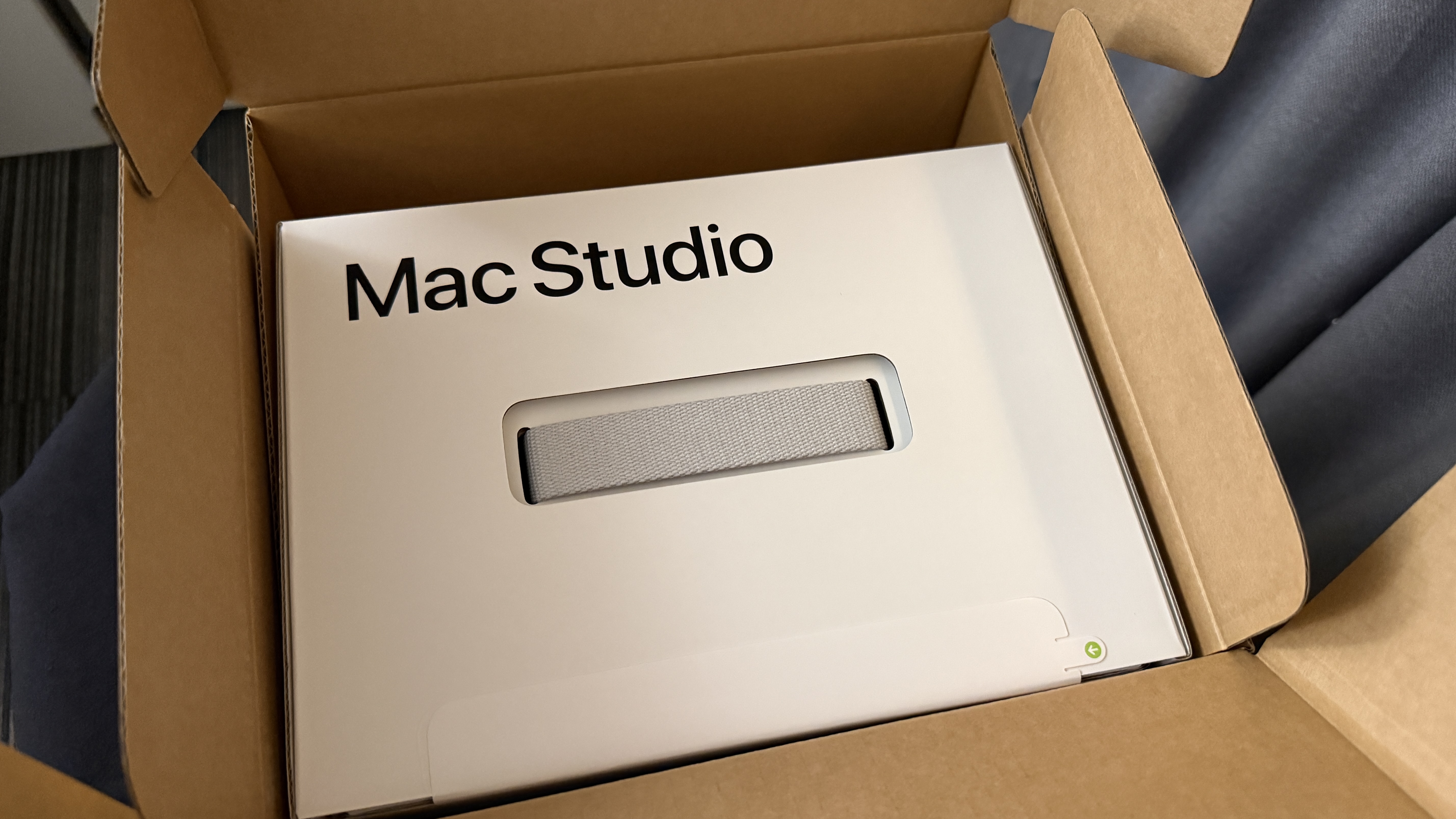 봉인 탭을 뜯고 박스를 여니 오늘의 주인공, Mac Studio의 진짜 박스가 모습을 드러냈다. 손잡이가 달려 있어 박스째로 들고 다닐 수 있고, 박스에서 잡아 꺼낼 수 있게 되어 있는 점이 인상적이었다. 봉인 탭을 뜯은 겉 박스는 바로 재활용하기 쉽게 순식간에 분해되었다. 정말이지 환경 환경 하는 애플답다.