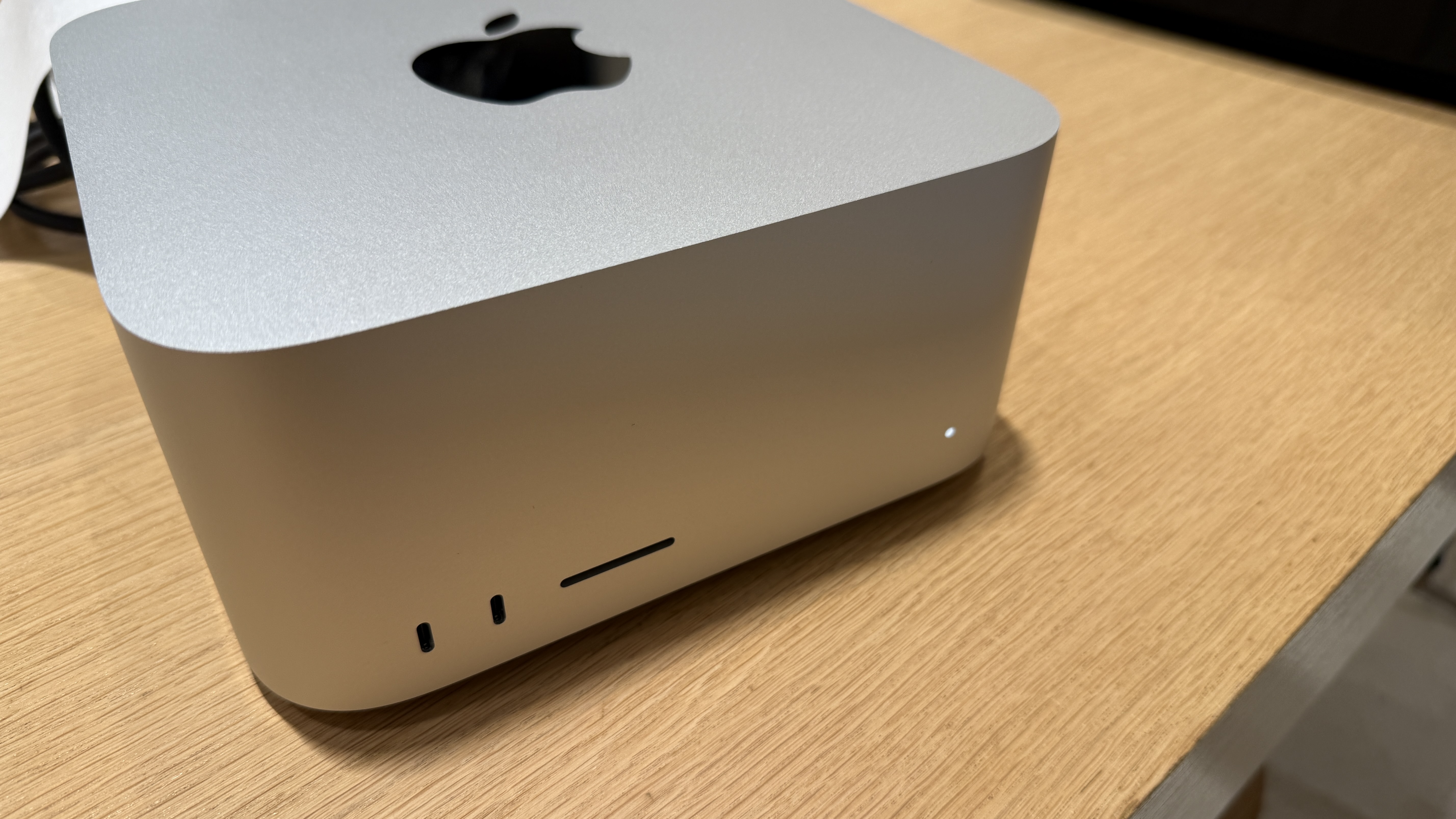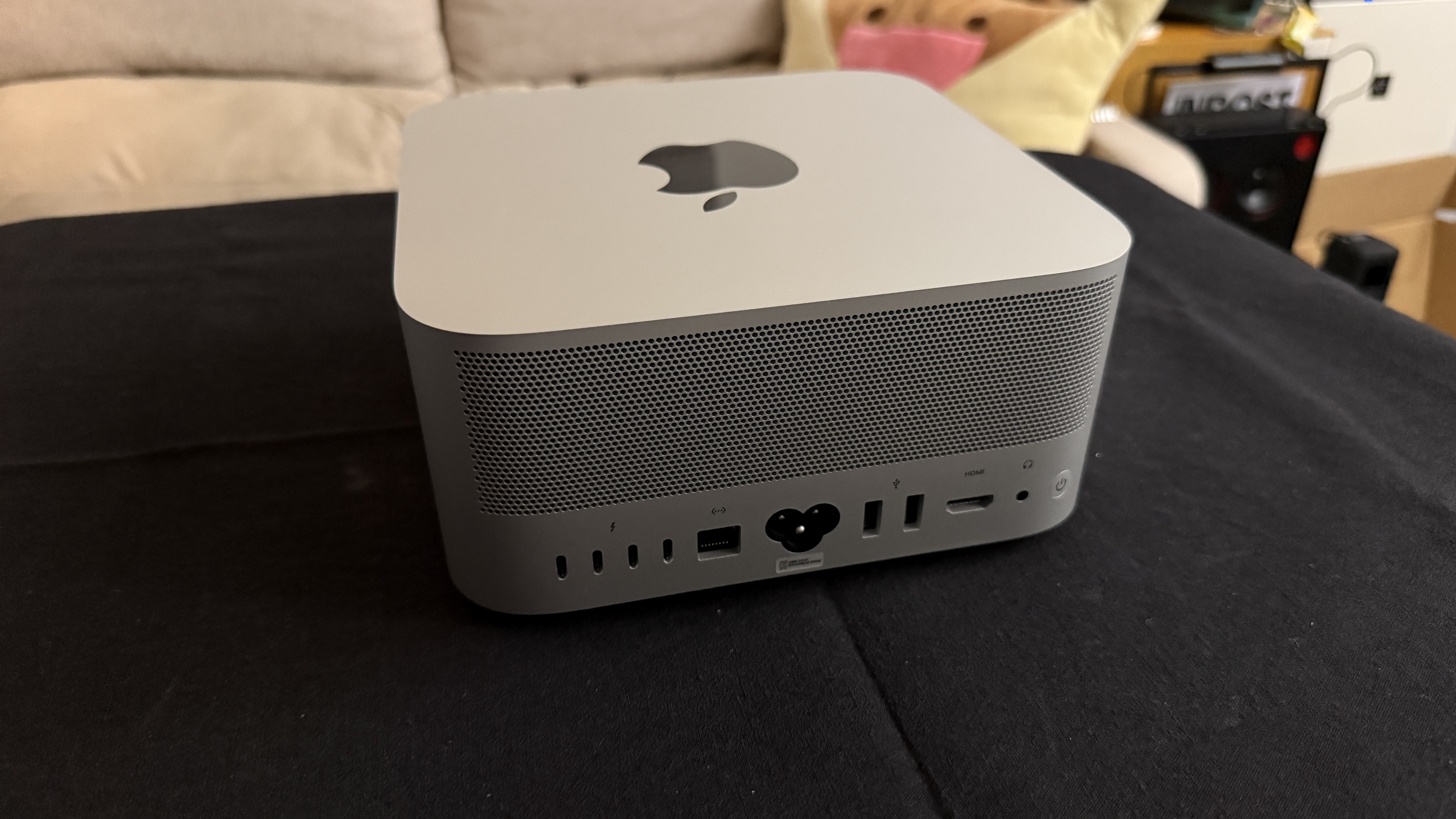 후면 포트도 다시 한번 확인해보자. 위에서 언급한 포트들이 다 달려 있으니 일단 문제는 없어 보인다. 포트 위쪽의 작은 타공망들이 보일 텐데 이 부분은 공기를 밖으로 내보내는 부분이다. 기존 Mac Mini는 포트와 약간 간섭이 있어 꽂아 놓은 케이블들이 뜨거워지는 문제들이 있었는데 물리적으로 분리되어 있어 케이블이 상할 수 있다는 걱정은 하지 않아도 된다. 애초에 Apple Silicon이 사용된 Mac이 쉽사리 뜨거워지지 않는다는 점도 있다.