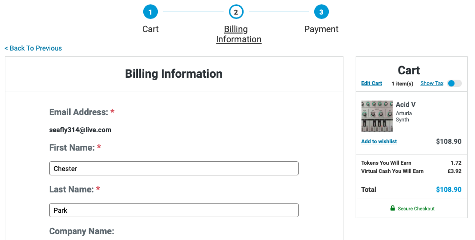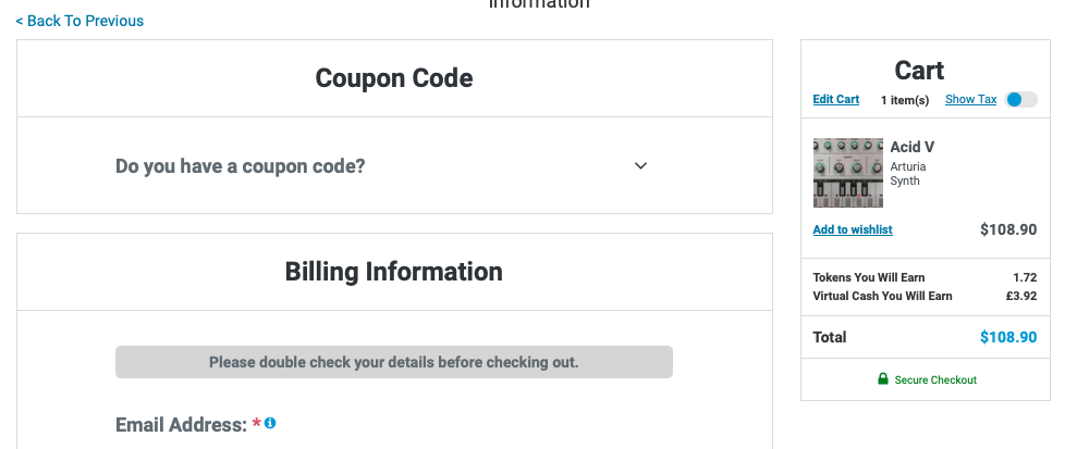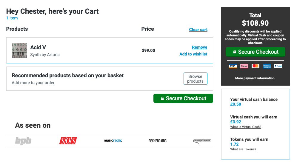 홈페이지 상단 우측에 자리 잡은 Cart를 누르면 다음과 같은 화면이 나타난다. 이 화면에서는 이번 구매로 적립되는 캐시, 구매로 적립되는 토큰을 확인할 수 있으며 상품 구매로 받을 수 있는 무료 선물을 선택할 수 있다. 만일 Plugin Boutique에서 처음 구매한다면 Claim Gift를 클릭해서 무료 선물을 받아가는 게 좋다. 플러그인 하나만 샀을 뿐인데 공짜로 다른 플러그인들도 가져갈 수 있다. 무료로 받을 수 있는 플러그인들은 기간에 따라 다르니 미리 구매 전에 어떤 걸 무료로 주는지 체크해 보는 것도 좋다. 모든 작업이 완료되었다면 초록색 "Secure Checkout"을 눌러 다음 화면으로 넘어가자.