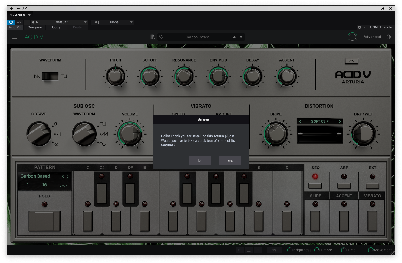 튜토리얼 창을 지난 후 Acid V의 모습이 눈에 천천히 들어오는데, 이거 디자인이 기깔난다. 실제 하드웨어와 크게 다르지 않은 디자인이다. 전체적인 은빛에 초록색으로 포인트를 준 게 꽤 인상적이다. 하단에 실제 하드웨어에 있는 1옥타브 건반까지 충실하게 재현했다. 물론 디지털로 이식된 만큼 하드웨어와는 약간의 차이는 있지만, 충실한 구현도에 놀랐다. 역시 Arturia다.