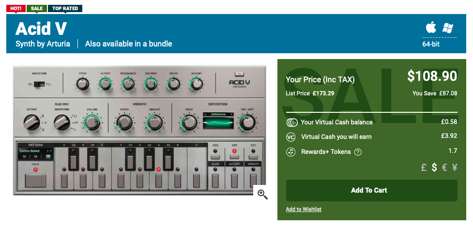 본 페이지의 Arturia Acid V 구매 링크 (PluginBoutique)를 클릭하거나, Plugin Boutique(링크)에 접속한 후, 검색창에 "Acid V"를 검색하면 위와 같은 화면이 나타난다. Plugin Boutique는 회원 가입을 하지 않아도 상품 구매가 가능하지만, 회원 가입을 하는 편이 추후 라이센스 관리에 용이하다. 기본값은 파운드화로 나타나지만 달러나 엔, 유로화로 가격을 바꿔가며 확인할 수 있다. 다만, 대한민국 원은 지원하지 않으므로 해외 결제가 지원되는 카드나 페이팔 계정을 미리 준비할 필요가 있다. Add to Cart를 클릭하여 상품을 내 장바구니로 담자.