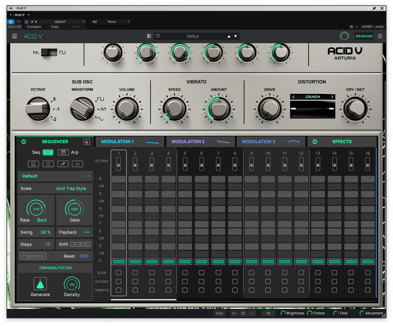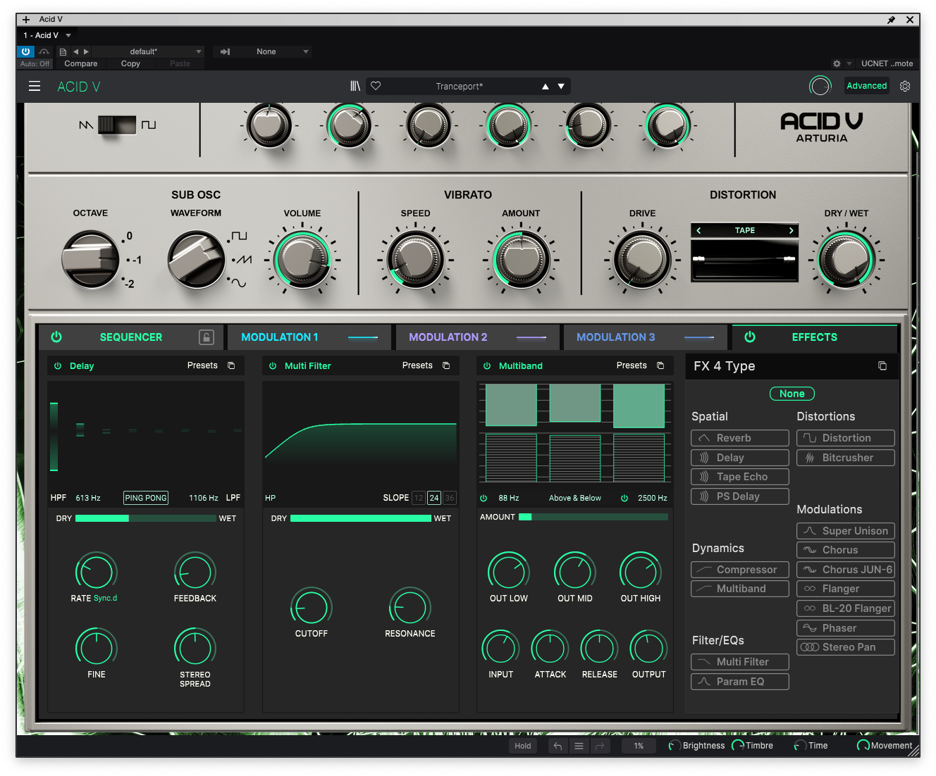 최우측의 Effect에는 Acid V 내부적으로 다양한 이펙터들을 걸어서 사용할 수 있다. OTT 스타일의 멀티밴드 컴프레서부터 딜레이 등 따로 출시해도 좋을 것 같은 이팩터들이 한가득 내장되어 있다. 총 17개의 이펙터들이 내장되어 있어 최대 4개까지 걸어 원하는 대로 사운드를 변조할 수 있다. 필자가 마음에 들었던 기능 중 하나는 Arturia에서 디지털 복각한 다른 아날로그 이펙터들이 들어가 있다는 점이었다. BL-20 Flanger부터 Jun-6 코러스 등 따로 사용했을 때 꽤 마음에 들었던 낯익은 이펙터들도 있어서 TB-303 실기를 사용했을 때보다 더욱 다양한 결과물을 뽑아낼 수 있다.