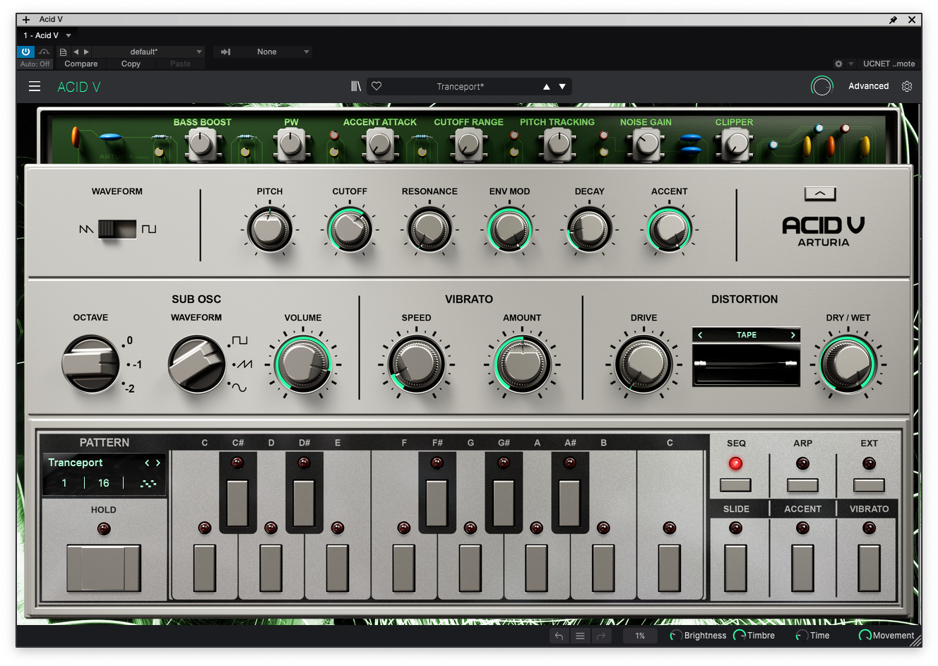 Arturia 플러그인들이 무릇 그렇듯, Acid V에도 추가적인 확장 기능들이 숨어 있다. Acid V 글자 상단의 화살표를 누르면 숨겨져 있던 기판이 드러나며 추가적인 기능을 쓸 수 있게 된다. 기판에서 베이스 부스트, 컷오프 범위, 클리퍼 등 유용한 기능들을 조절할 수 있어 꽤 유용하다.