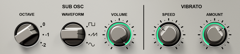 위에서 만든 사운드에 무언가 부족함이 느껴진다면 하단의 Sub Osc를 통해 깊은 베이스를 만들어보자. 옥타브 설정은 0부터 -2까지 설정할 수 있고 스퀘어, Saw, 사인 등 기본적인 파형을 선택해 블렌딩 할 수 있다. 우측의 Vibrato는 주파수에 따른 비브라토 속도를 설정할 수 있다. Amount는 비브라토가 얼마나 걸리게 할 건지를 설정할 수 있다. 상황에 맞춰서 잘 조절하자.