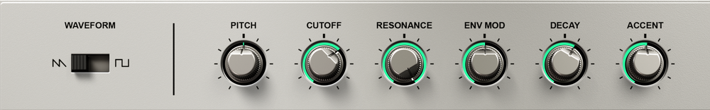 Acid V를 프리셋을 사용하는 것도 좋지만, 각각의 기능을 직접 만져보는 것도 좋다. 다행인 건, TB-303 하드웨어가 생각보다 조작법이 간단하다. 그렇기에 Acid V 또한 조작법이 굉장히 단순하게 되어 있어 원하는 사운드 톤을 다듬을 수 있다. 최상단에 있는 Waveform 토글 버튼을 통해 기본 파형을 Saw 혹은 스퀘어 중 하나로 선택할 수 있다. Acid의 느낌은 Saw에서 나온다고 생각하기에 필자는 주로 Saw를 쓰고 있다. Waveform 토글 버튼 옆에는 피치, 컷오프, 레조넌스, 엔벨롭 모듈레이션, 디케이, 악센트 노브가 있는데 신디사이저를 어느 정도 만져본 사람이라면 많이 낯익은 노브들이다.