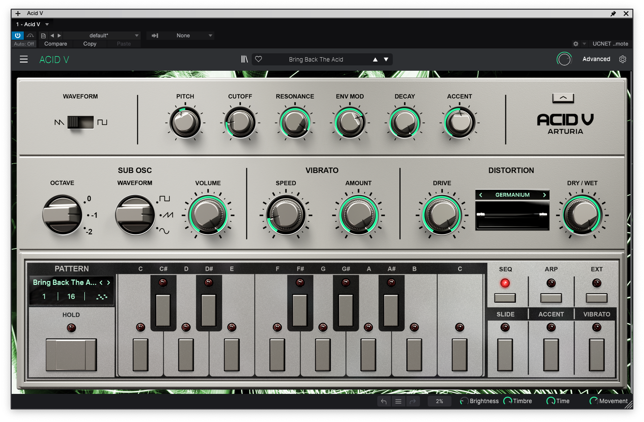 튜토리얼 창을 지난 후 Acid V의 모습이 눈에 천천히 들어오는데, 이거 디자인이 기깔난다. 실제 하드웨어와 크게 다르지 않은 디자인이다. 전체적인 은빛에 초록색으로 포인트를 준 게 꽤 인상적이다. 하단에 실제 하드웨어에 있는 1옥타브 건반까지 충실하게 재현했다. 물론 디지털로 이식된 만큼 하드웨어와는 약간의 차이는 있지만, 충실한 구현도에 놀랐다. 역시 Arturia다.