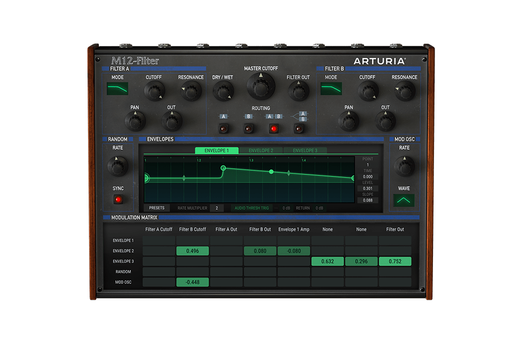 M12-Filter에서 눈에 띄는 점이라면, 엔벨로프를 시각적으로 표시해주기 때문에 자신이 원하는 엔벨로프 파형을 직접 마우스로 만들어낼 수 있다. 오리지널 하드웨어는 전혀 이렇지 않기 때문에 매우 의외의 디자인이다. 결과적으로 M12-Filter는 아날로그의 느낌을 유지하면서 엔벨로프를 직접 만들어낼 수 있다. 세럼을 사용해봤던 프로듀서라면 이러한 부분은 굉장히 장점이라고 느껴질 텐데, 잘 이해가 가지 않는다면 화면을 올려 Mini-Filter의 레이아웃을 보고 다시 돌아오자. 무척 천사 같아 보일 것이다. 단, M12-Filter의 엔벨로프는 세럼처럼 직접 그릴 수는 없다.