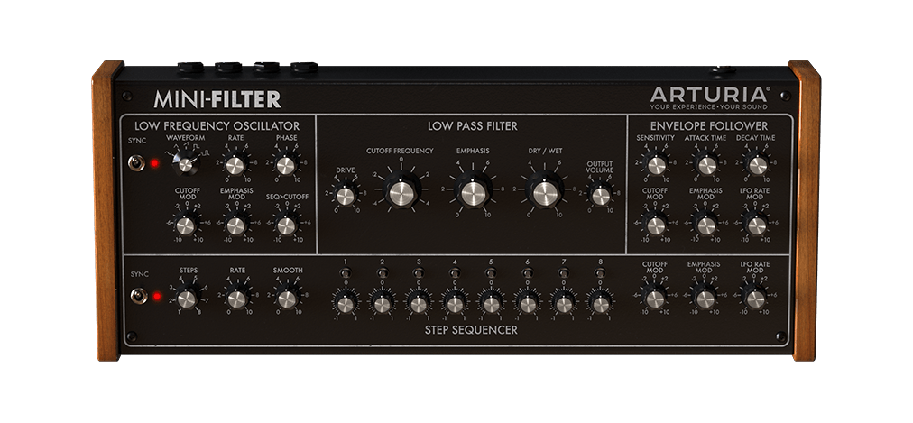 - Mini-Filter: Moog 사의 신디사이저에 적용된 특징적인 필터. Ladder Filter 모델링. 오리지널 하드웨어와 동일한 디자인. 부드럽게 깎이는 컷오프가 특징. 스텝 시퀸서가 있어 다양한 느낌의 오리지널 하드웨어를 그대로 구현했기 때문에 직관적이지 않음.