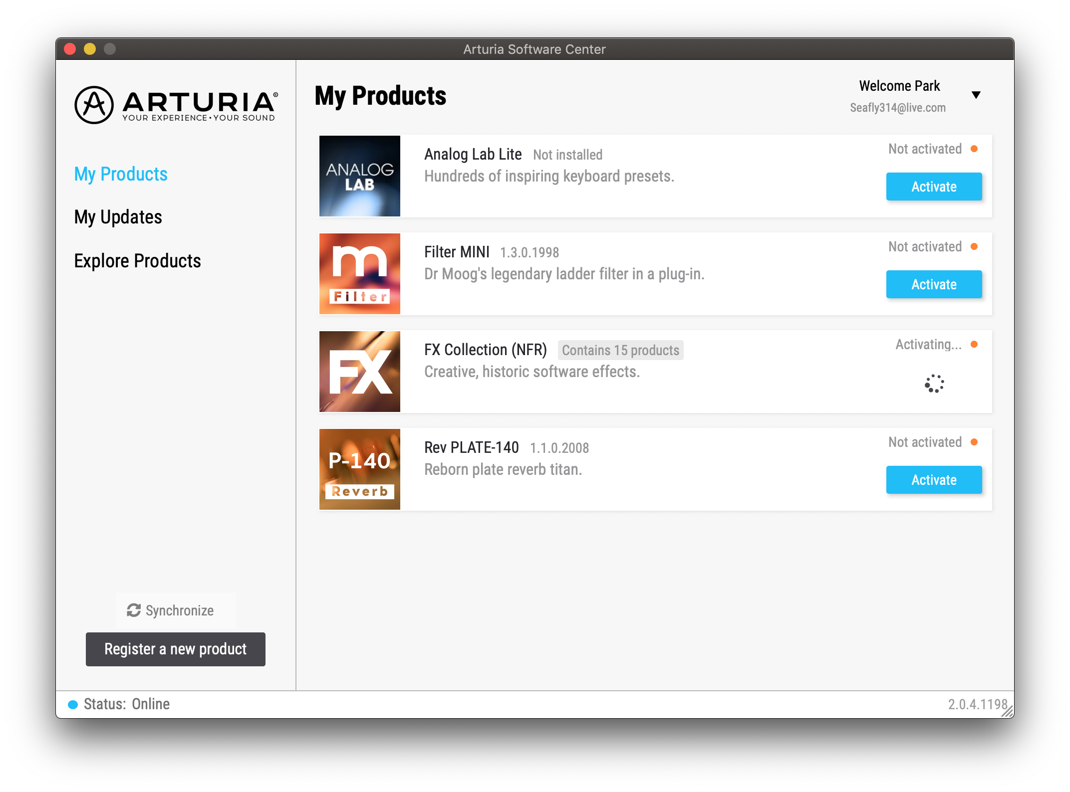 정상적으로 시리얼 키와 잠금 해제 번호를 입력하였다면, My Product에 FX Collection이 정상적으로 등록된 걸 확인할 수 있다. 그러나, 여기서 끝이 아니다. 시리얼을 등록했으니 컴퓨터에 설치 및 라이선스를 인증하는 과정이 남아있다. 홈페이지에서 설치 파일을 일일이 내려받을 수도 있지만 Arturia는 몇 번의 클릭만으로 컴퓨터에 플러그인을 설치 및 인증할 수 있게끔 플러그인 매니저, Arturia Software Center를 제공하고 있다.