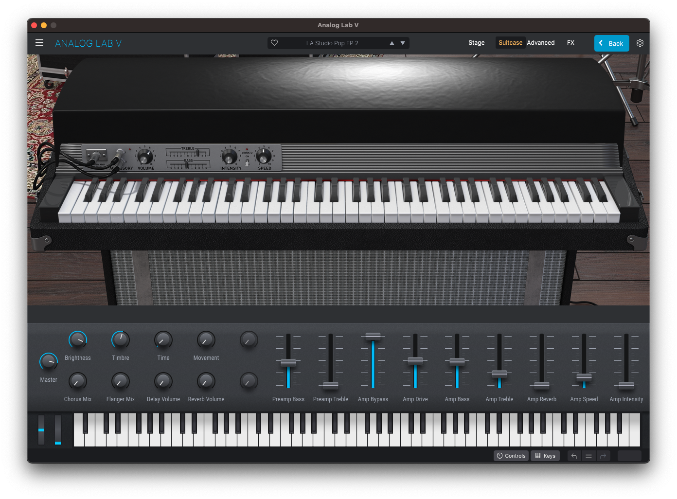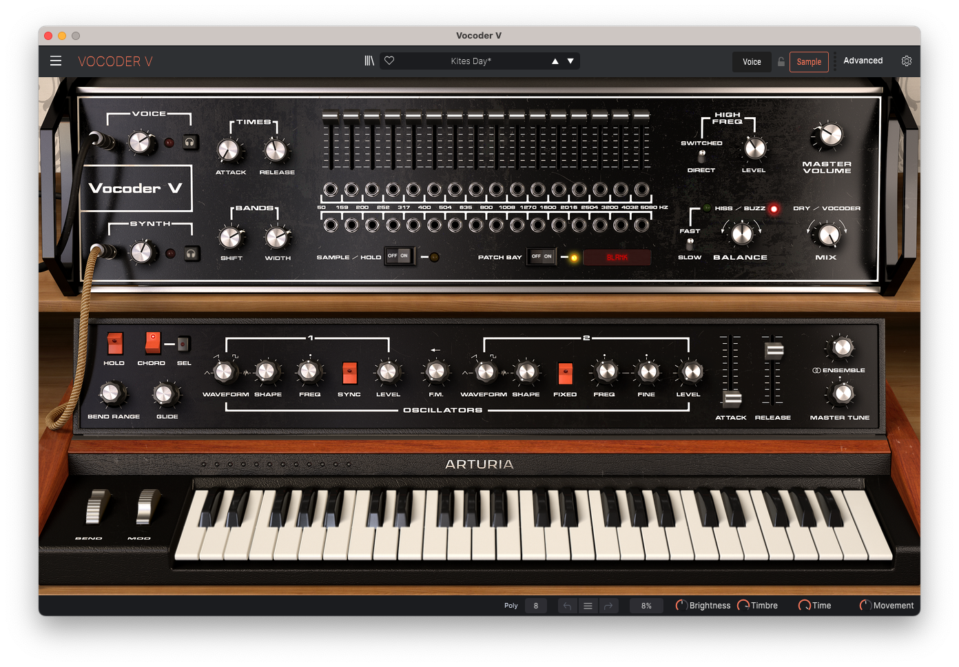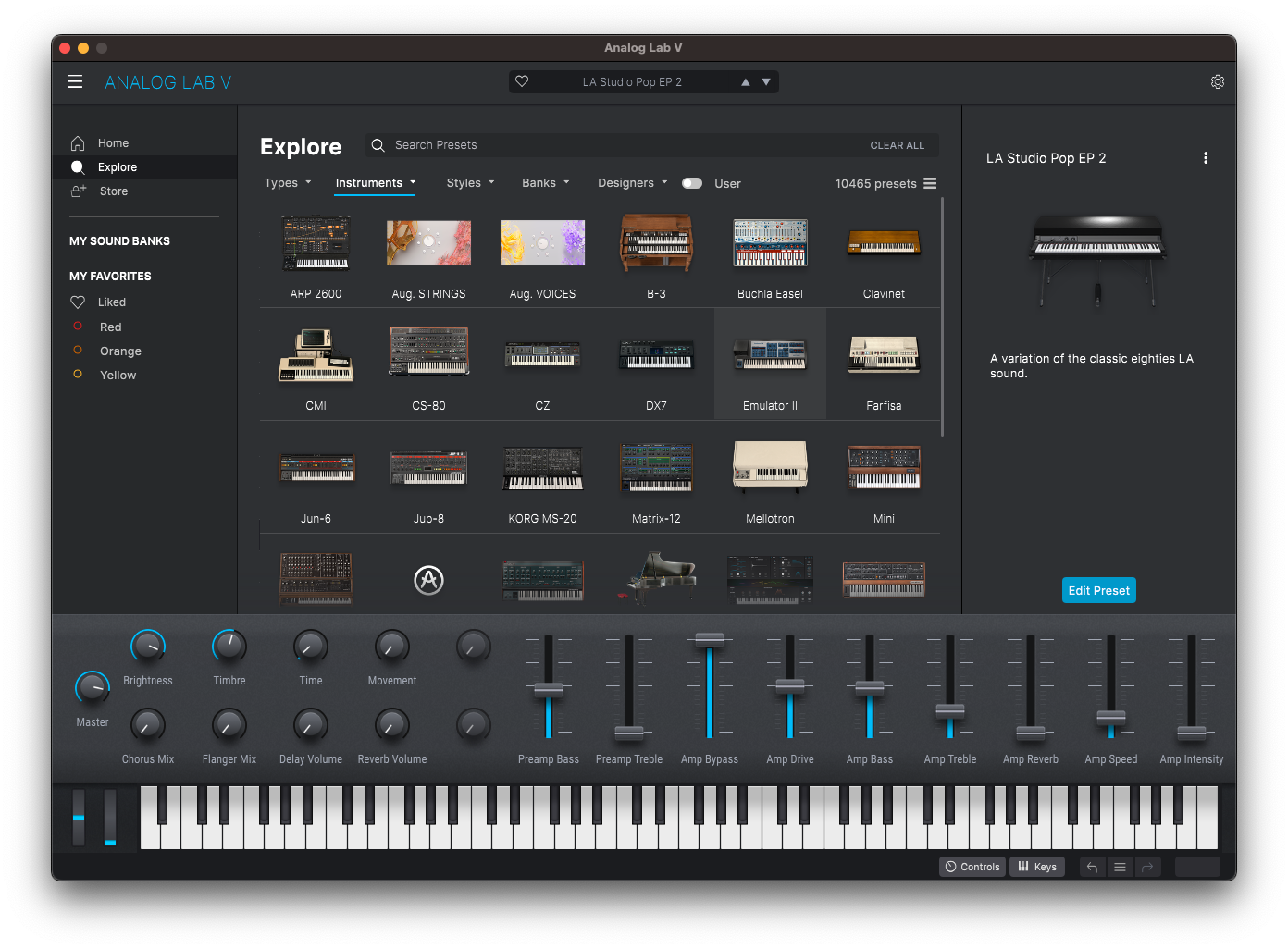 자신이 가지고 있는 악기 프리셋을 고른 후, "Edit Preset" 버튼을 누르면 악기 이미지가 나타나면서 매크로 값을 넘어서 세부 디테일을 조절할 수 있게 된다. 만일 자신이 가지고 있지 않은 악기 프리셋을 고른 후 Edit Preset을 클릭하면 악기를 구입하라는 메시지가 뜬다. 필자의 경우 Augmented Voice가 쓰고 싶었지만 V Collection 8에는 포함되어 있지 않아 Analog Lab V를 이용해 Augmented Voice의 사운드를 이용했다.