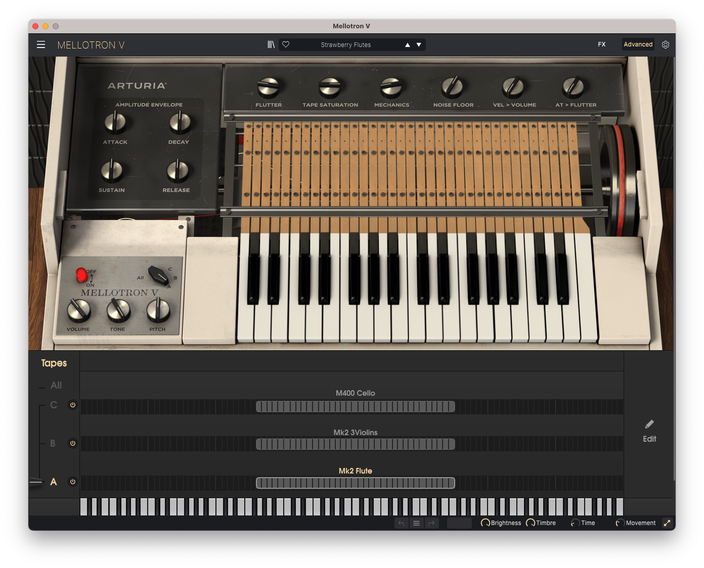 빈티지에 껌뻑 죽는 Arturia가 멜로트론을 복각 안 할 리가 없다. Mellotron V라는 이름으로 같게. 그러나 조금 더 진일보한 방향으로 만들어냈다. 전체적인 디자인은 오리지널 멜로트론과 거의 흡사하다. 그러나 뚜껑을 열게 된다면 무척 다양한 기능들이 추가되어 있음을 확인할 수 있다. 첫 번째로 추가된 기능은 테이프 샘플러와 관련된 설정이다. Wow / Flutter, 테이프 새츄레이션, 테이프 구동음, 심지어 샘플러가 돌아가면서 나는 소리까지 조절할 수 있다.