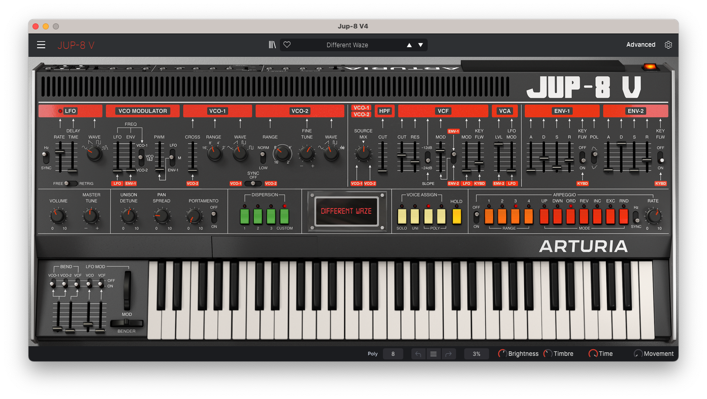 Arturia에서도 Roland Jupitor-8을 Jup-8이라는 이름의 디지털 플러그인으로 빚어냈다. 특징적인 아르페지오 버튼 및 폴리 버튼들을 충실히 재현했다. 또한 오리지널에 없는 기능을 추가했는데, 추가적인 LFO를 2개 더 추가했고, 아르페지오를 넘어서 시퀸서를 추가했다. 또한 벨로시티 및 애프터 터치 커브를 수정할 수 있고, 컴프레서, 비트크러셔 등 이펙터를 추가했다. 새롭게 추가된 기능들로 인해 Jup-8은 빈티지한 사운드를 낼 수도 있고 현대적인 프로세싱이 가미된 사운드를 만들 수 있게 되었다.