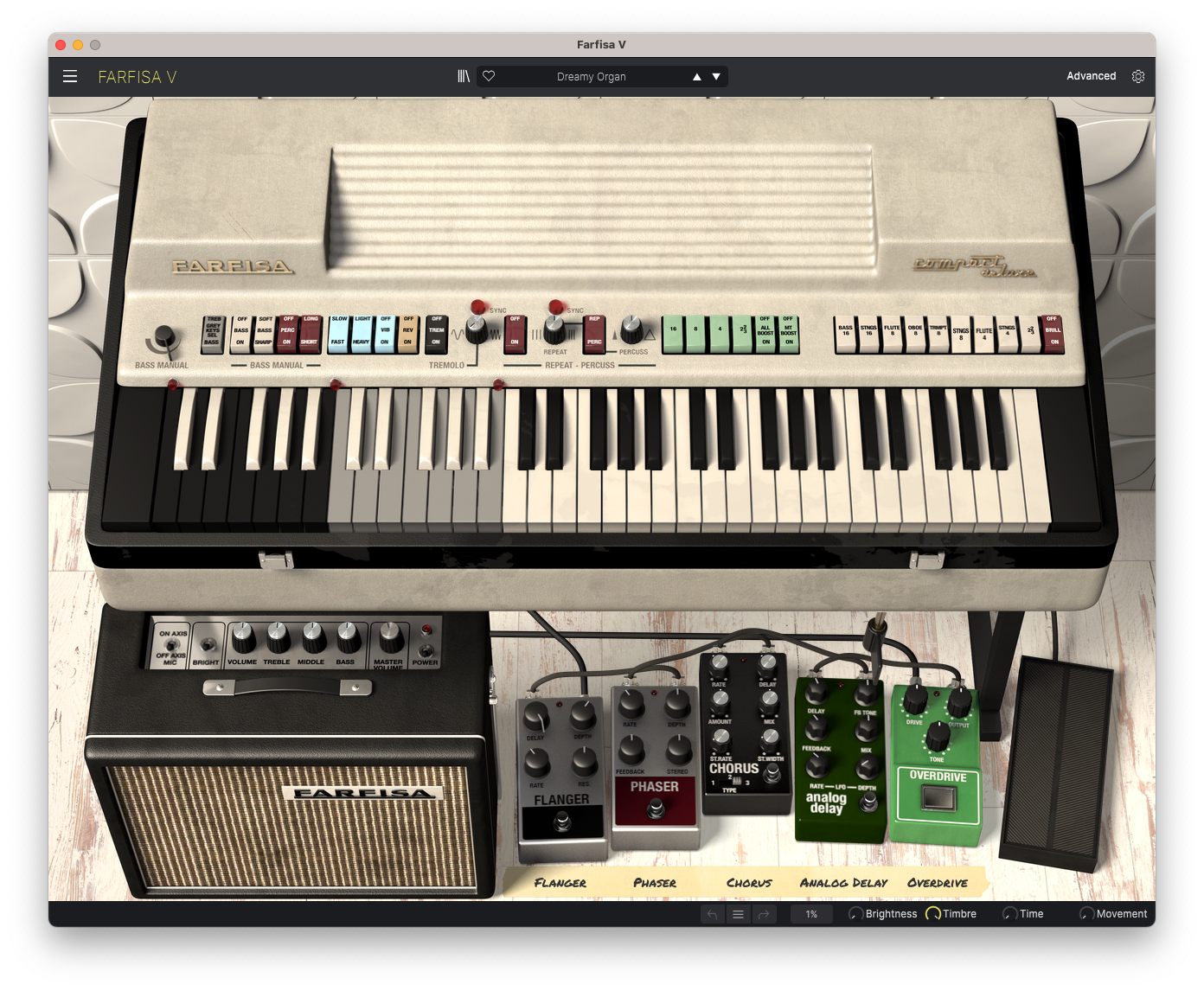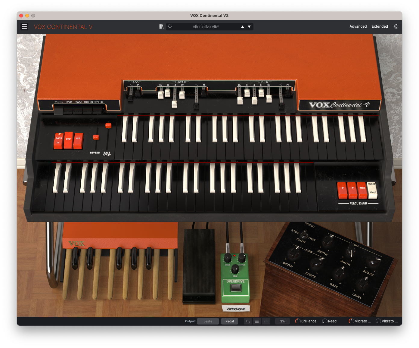 Arturia는 정밀한 모델링 기술을 바탕으로 Vox Continental을 Vox Continental V라는 이름을 가진 디지털 악기로 만들었다. 오리지널이 가지고 있는 흑건과 백건 디자인, 드로우바의 디자인 등 하나하나 세심하게 모델링했다. Extended 모델로 전환하여 사용할 수도 있어서 오리지널 모델 대비 조작할 거리가 많아졌다. 상단의 Advanced 버튼을 누르면 각 키의 세미톤을 조절할 수 있는데, 최대 +/- 50 세미톤을 조절할 수 있다. 인위적으로 음이 나가게끔 오르간 사운드를 만들 수 있어 더욱 빈티지한 느낌을 가져갈 수 있다.