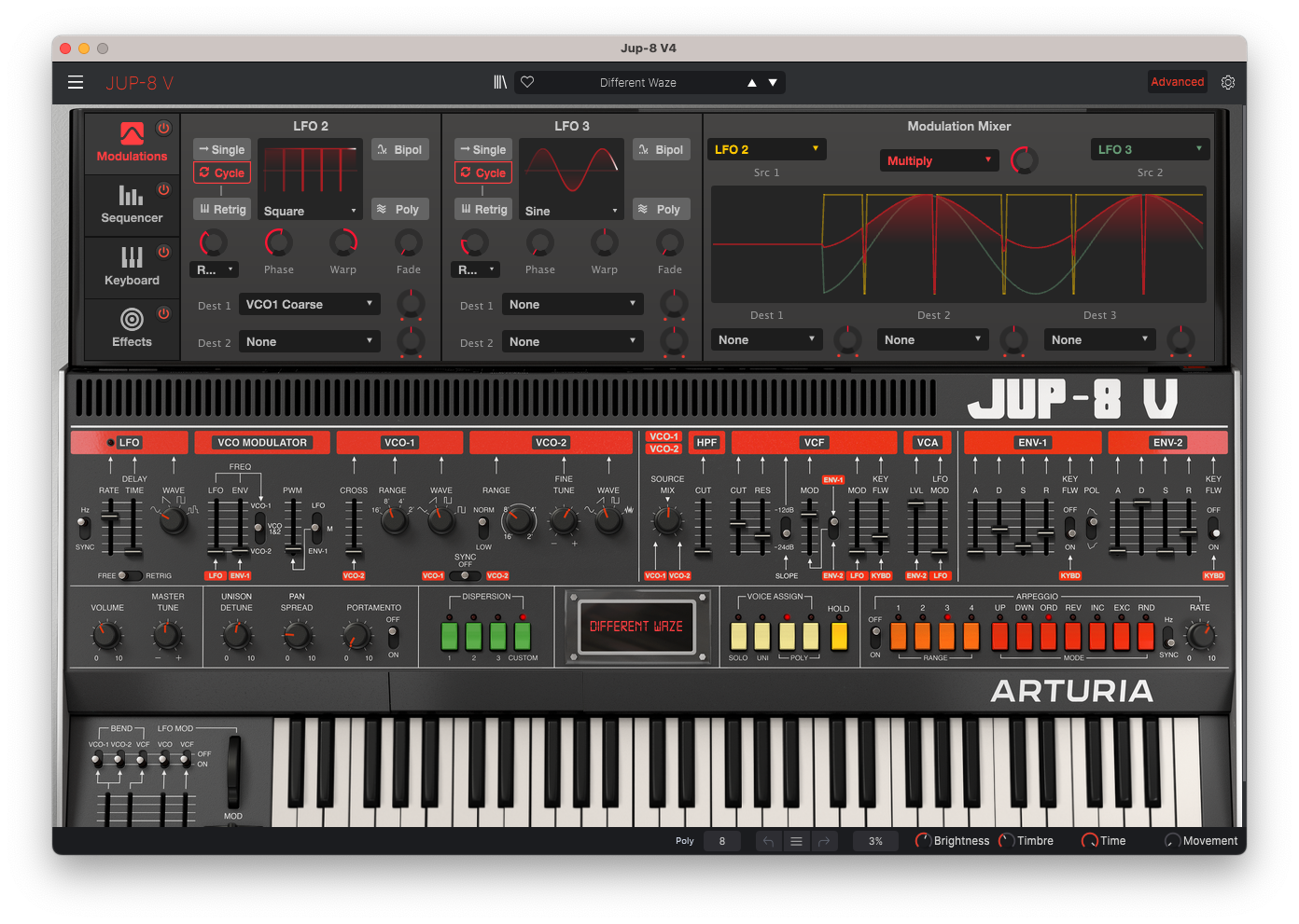참새가 방앗간을 못 지나친다고, Arturia가 JUNO-60을 복각하지 않는다는 건 말이 안 되었다. JUNO-60의 특징인 아르페지오 모듈, DCO 모듈, 그리고 코러스. Arturia는 어느 부분 하나 빠지지 않고 디지털로 옮겨 Jun-6 V를 만들어내었다. Jun-6 V는 오리지널 모델과 거의 동일하지만 Arturia만의 커스텀이 살짝 들어가 있다. 상단의 방열구멍을 클릭하거나 Advanced를 누르면 추가적인 LFO와 엔벨롭, 그리고 오리지널엔 없던 딜레이 및 리버브 모듈이 추가되어 있다. 다른 신디사이저에 비하면 많은 기능이 추가되진 않았는데, Arturia 역시 명작에 크게 손을 대는 건 어려웠나 보다.