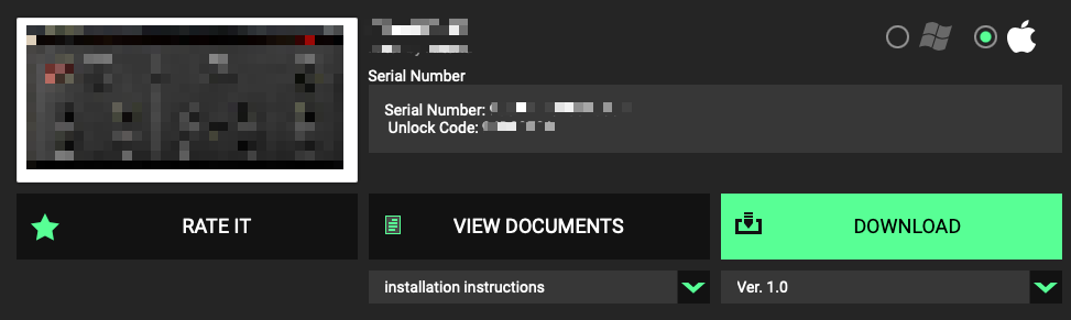 결제가 끝난 후, 상단의 "My Account"를 클릭하면 방금 전에 구매한 Arturia V Collection의 시리얼 번호가 표시되어 있다. 여기서 설치 파일 다운로드와 설치 시 주의사항 등을 확인할 수 있다. 만일 시리얼 대신 영문으로 긴 안내문이 표시되어 있다면 아직 전산상으로 시리얼 번호가 발급되지 않았다는 뜻이므로 조금 기다려야 한다.
