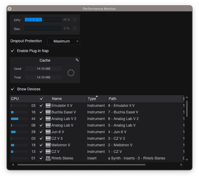 Arturia의 악기들은 "매우 무겁다"라는 소리를 자주 듣는다. 필자기 Pigments 리뷰를 한다고 했을 때도, 주변인들의 반응은 "그거 무거운 신디사이저 아니냐" 라는 반응이었다. 그리고 실제로 무겁긴 했다. V Collection의 신디사이저 역시 같은 문제가 있지 않을까 하는 우려가 있었다. 결론부터 말하면 V Collection의 신디사이저들은 우리가 자주 사용하는 Serum, Spire 등의 신디사이저보다 무거운 편이다. Arturia 제 플러그인들도 그렇고 신디사이저들도 무겁다.
