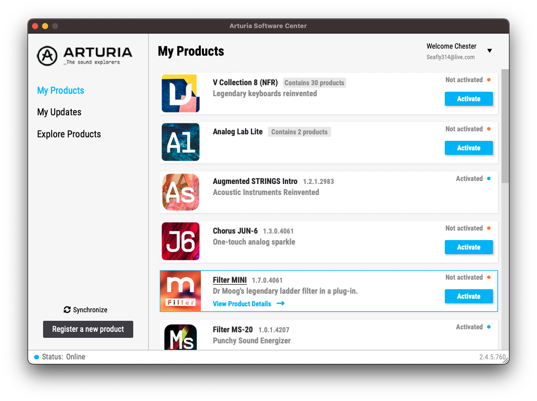 다음과 같은 화면이 나왔다면 Arturia 계정에 성공적으로 V Collection이 등록되었다. 이제 설치가 남았다. 수동으로 V Collection 설치 파일을 받아 설치할 수도 있지만 양이 워낙 방대하기도 하고, 컴퓨터 인증 등의 기타 이유로 Arturia에서는 Arturia Software Center(ASC)를 이용하기를 권장하고 있다. 추후 Arturia의 플러그인 업데이트도 ASC를 이용하기 때문에 되도록 설치하자.