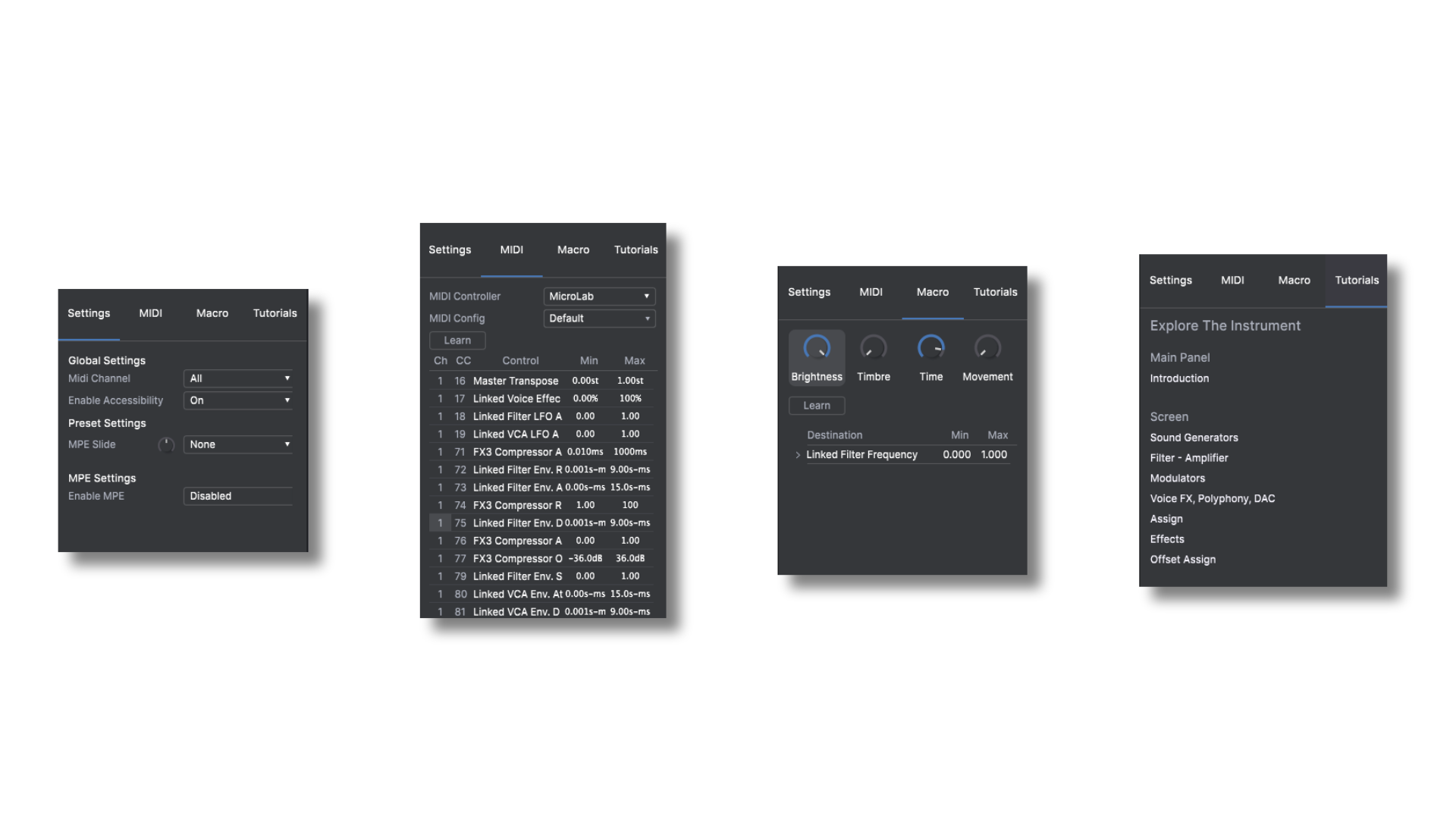 우측 상단의 톱니바퀴 버튼을 누르면 추가적인 화면이 나타난다. 각 신디사이저의 글로벌 세팅이나 마스터 튠 설정, MIDI 컨트롤러 설정, 미디 컨트롤러에서 사용할 수 있는 매크로 노브 설정 및 튜토리얼을 여기서 확인할 수 있다. 각각의 신디사이저에 익숙해지지 않은 사용자라면 우측의 튜토리얼은 자주 보게 될 화면이다. Arturia 마스터 키보드나 신디사이저를 사용하고 있다면 V Collection에 자동으로 기능 매핑이 되니 V Collection을 자주 사용할 사람이라면 Arturia의 마스터 키보드를 도입하는 것도 나쁘지 않다.