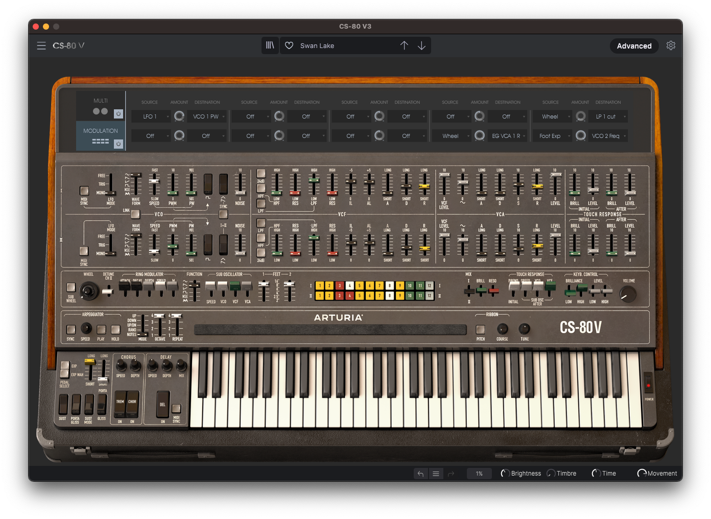 Arturia에서도 CS-80을 복각해서 CS-80 V라는 이름으로 출시했다. 오리지널 모델과 크게 달라진 점은 없지만, 상단의 Advanced 버튼을 누르거나, 방열판을 클릭하면 폴리 및 모듈레이션 설정을 할 수 있다. 피치 휠로 가운데의 리본 컨트롤러를 조절할 수 있으며, 모듈레이션 휠은 링 모듈레이터 근처의 휠을 조절할 수 있다. 가운데의 컬러풀한 버튼들이 인상적인데, 각 버튼마다 VCO, VCF, VCA 값을 저장할 수 있어 같은 프리셋이더라도 버튼을 누르면 미리 설정해 둔 다른 값들을 불러올 수 있다. 오리지널 모델에서는 컬러풀한 버튼들은 오르간, 피아노 등 특정 악기들의 톤을 모델링하는 톤 셀렉트 버튼이다. CS-80V는 생각보다 재밌는 소리가 많아서 혼자 가지고 놀기에 좋았다.