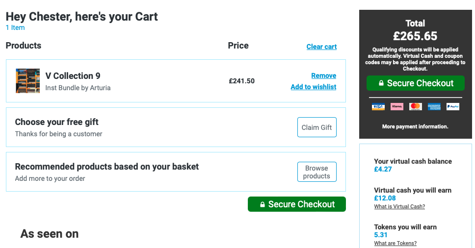 Arturia V Collection 구매 링크 (PluginBoutique)를 클릭하거나, Plugin Boutique(링크)에 접속한 후, 검색창에 "Arturia V Collection"을 검색하면 위와 같은 화면이 나타난다. Plugin Boutique는 회원 가입을 하지 않아도 상품 구매가 가능하지만, 회원 가입을 하는 편이 추후 라이센스 관리에 용이하다. 기본값은 파운드화로 나타나지만 달러나 엔, 유로화로 가격을 바꿔가며 확인할 수 있다. 다만, 대한민국 원은 지원하지 않으므로 해외 결제가 지원되는 카드나 페이팔 계정을 미리 준비할 필요가 있다. Add to Cart를 클릭하여 상품을 내 장바구니로 담자.