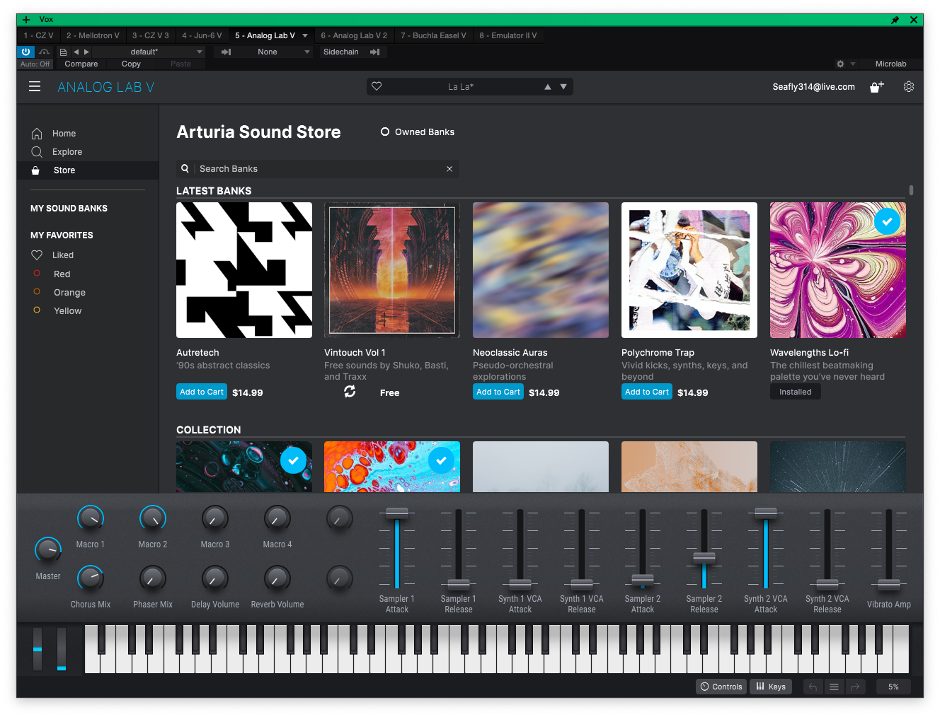 Pigments에서 본 적 있는 Arturia Sound Store는 V Collection에도 포함되어 있다. Analog Lab V에서만 사용할 수 있지만, Pigments와 마찬가지로 엄선된 프리셋들을 구입할 수 있다. 각 프리셋 팩에 있는 사운드를 미리 연주해 볼 수도 있게끔 되어 있다. 무늬만 사운드 스토어라고 불리는 다른 소프트웨어 신디사이저에 비하면 프리셋을 미리 사용해 볼 수 있는 등 많은 걸 해볼 수 있다. 그런데 유난히 Arturia Sound Store에 들어오면 랙이 걸리는 걸 봐선 무거움을 유발하는 원인이 이 녀석인 듯하다.