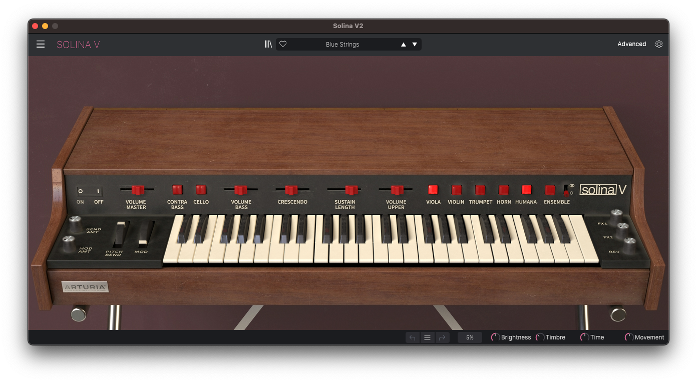 Arturia는 Solina String Ensenble을 Solina V라는 이름으로 복각했다. 오리지널 하드웨어와 비교하면 왠지 선택할 수 있는 악기의 종류가 늘었다. 호른이랑 트럼펫 등의 음원 선택 버튼이 생겨서 보다 표현할 수 있는 범위가 늘었다. 디지털로 이식되면서 Arturia의 커스텀이 조금 더 들어갔는데, LFO 및 베이스의 질감을 바꿀 수 있는 노브들의 추가, 그리고 아날로그 코러스 및 딜레이 추가 등이 있다. Upper Resonator라는 기능이 눈에 띄는데, 로우, 밴드, 하이의 3개로 나눠 레조넌스를 강조할 수 있는 기능이다. 바이올린에 걸어 사용하면 바이올린의 하이가 보다 풍성해진다.