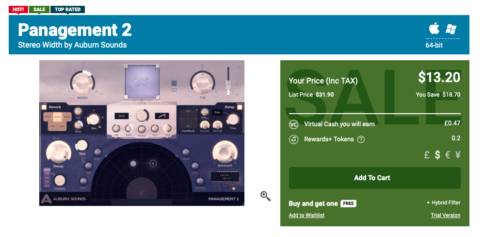 Auburn Sound Panagenet 2 구매 링크 (PluginBoutique)를 클릭하거나, Plugin Boutique(링크)에 접속한 후, 검색창에 "Auburn Sound Panagement 2"를 검색하면 위와 같은 화면이 나타난다. Plugin Boutique는 회원 가입을 하지 않아도 상품 구매가 가능하지만, 회원 가입을 하는 편이 추후 라이센스 관리에 용이하다. 기본값은 파운드화로 나타나지만 달러나 엔, 유로화로 가격을 바꿔가며 확인할 수 있다. 다만, 대한민국 원은 지원하지 않으므로 해외 결제가 지원되는 카드나 페이팔 계정을 미리 준비할 필요가 있다. Add to Cart를 클릭하여 상품을 내 장바구니로 담자.
