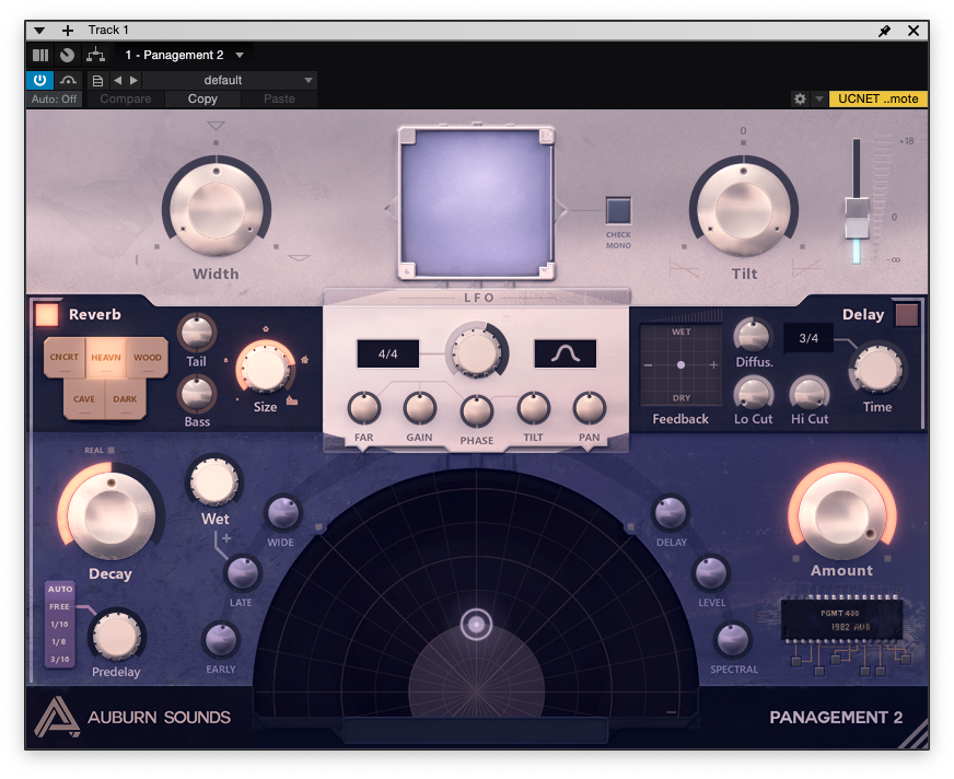 바로 하단에는 패닝 모듈이 거대하게 자리잡고 있다. 그리고 위에서 보았던 리버브 및 딜레이 모듈이 아래에도 확장되어 있다. Decay 노브 및 PreDelay 노브, 그리고 Amount 노브가 모서리에 위치해 있고, 리버브 모듈의 다른 기능들인 Early, Late, Wide와 Delay 모듈의 다른 기능인 Delay, Level, Spectral 등의 노브들이 자리잡고 있다. 그런데 위의 기능들보다는 상대적으로 눈에 띄진 않는다. 각 모듈들을 세부적으로 조절할 분들에게 적합하다.