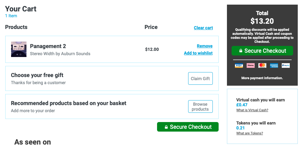 홈페이지 상단 우측에 자리 잡은 Cart를 누르면 다음과 같은 화면이 나타난다. 이 화면에서는 이번 구매로 적립되는 캐시, 구매로 적립되는 토큰을 확인할 수 있으며 상품 구매로 받을 수 있는 무료 선물을 선택할 수 있다. 만일 Plugin Boutique에서 처음 구매한다면 Claim Gift를 클릭해서 무료 선물을 받아가는 게 좋다. 플러그인 하나만 샀을 뿐인데 공짜로 다른 플러그인들도 가져갈 수 있다. 무료로 받을 수 있는 플러그인들은 기간에 따라 다르니 미리 구매 전에 어떤 걸 무료로 주는지 체크해 보는 것도 좋다. 모든 작업이 완료되었다면 초록색 "Secure Checkout"을 눌러 다음 화면으로 넘어가자.